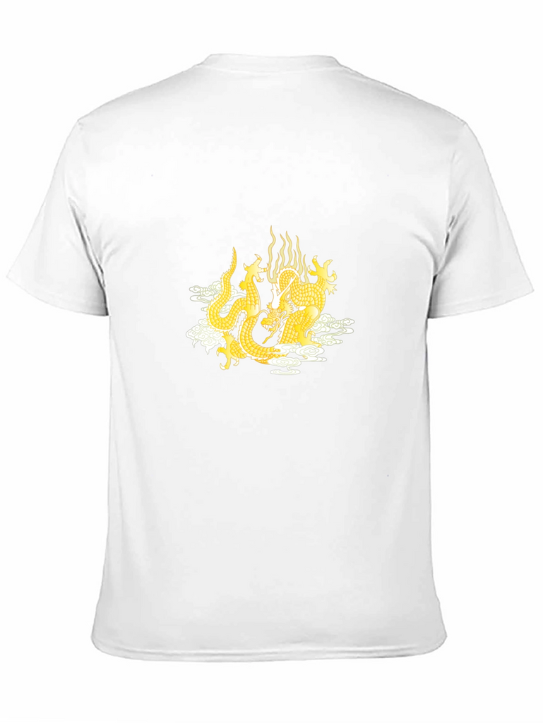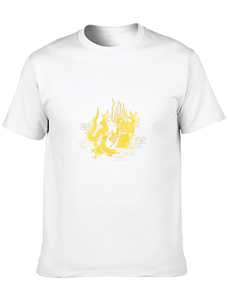 Elevate your style with this striking black t-shirt. The shirt features a bold golden dragon graphic, exuding power and mystique. Crafted from a soft, comfortable fabric, this tee offers a relaxed fit for all-day wear. The detailed dragon design, complete with swirling flames and clouds, makes a statement. Ideal for casual outings, concerts, or expressing your unique personality. Pair it with jeans or shorts for an effortlessly cool look. Make a bold impression with this eye-catching graphic tee.