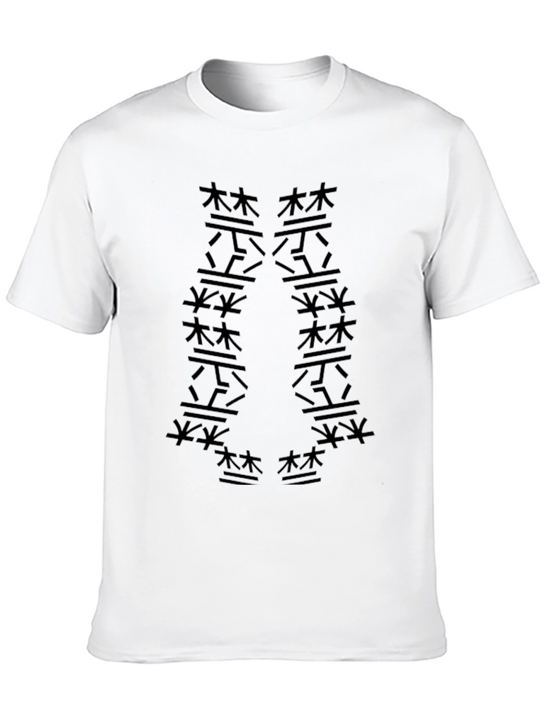This black t-shirt features a symmetrical design of Japanese characters arranged in the shape of a stylized forest. Made from a comfortable-looking cotton blend, this tee offers a relaxed fit perfect for everyday wear. The monochromatic design creates a subtle yet eye-catching graphic that is both stylish and unique. The shirt's classic cut makes it a versatile piece for layering or wearing on its own. Ideal for casual outings or adding an individual touch to your wardrobe. Show off your love for Japanese culture with this cool graphic tee.