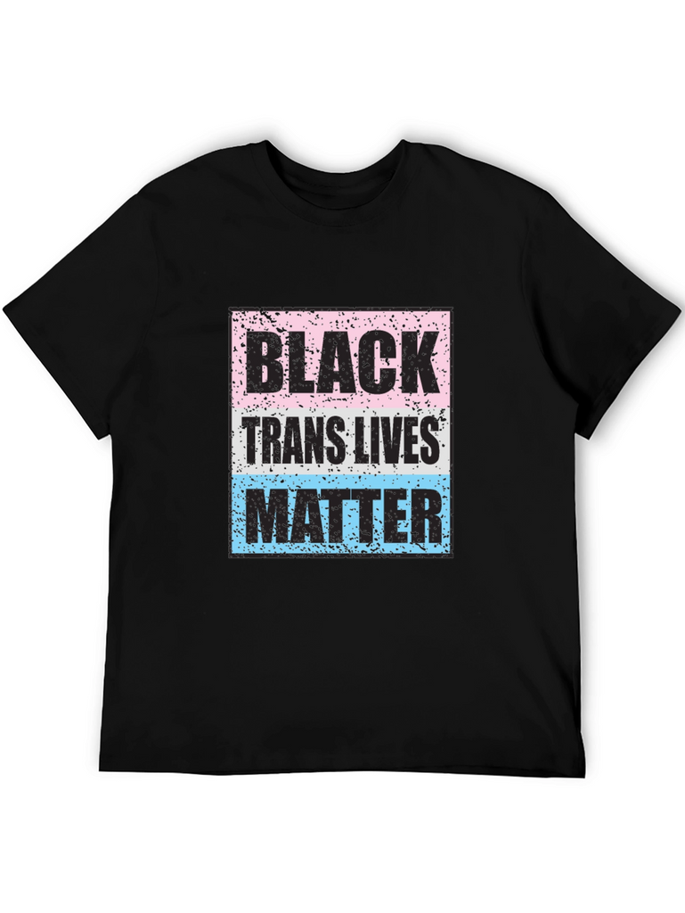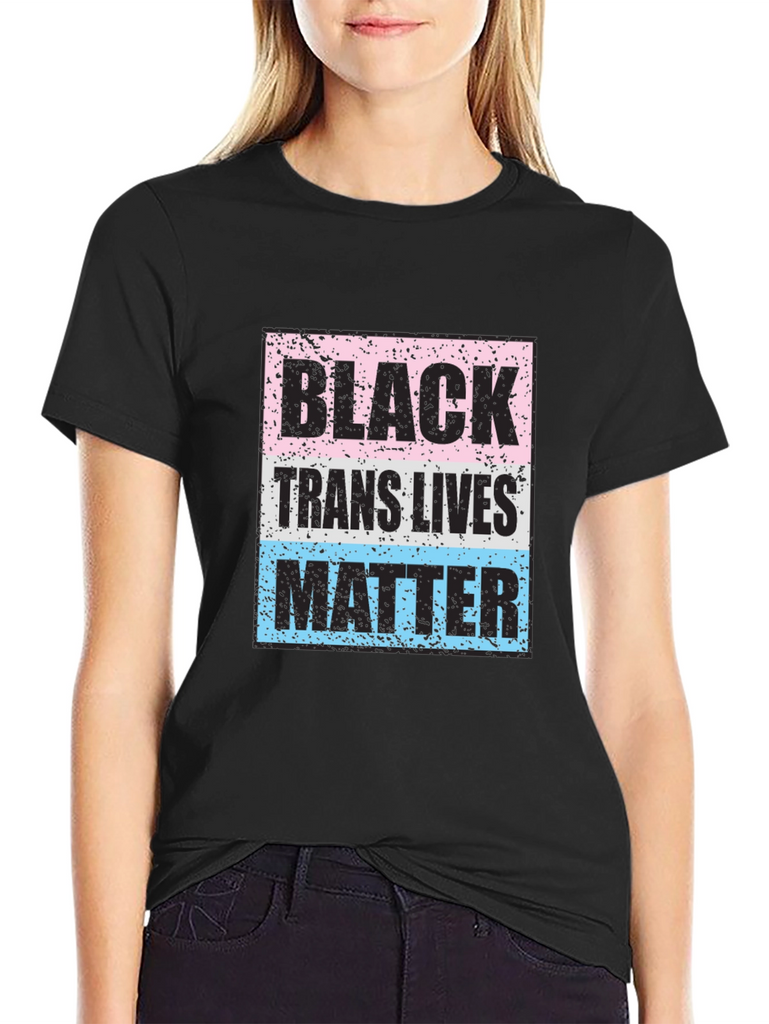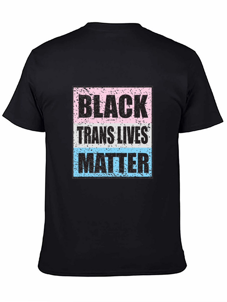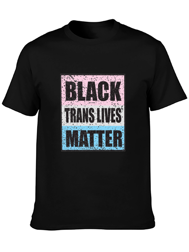Show your support with this powerful statement tee. This black unisex t-shirt features a bold "Black Trans Lives Matter" design, utilizing the colors of the transgender pride flag. The distressed print gives it a unique, edgy look. Made from what appears to be a soft and comfortable fabric, this tee is perfect for everyday wear, rallies, or casual outings. Make a statement and spread awareness with this impactful and stylish t-shirt.