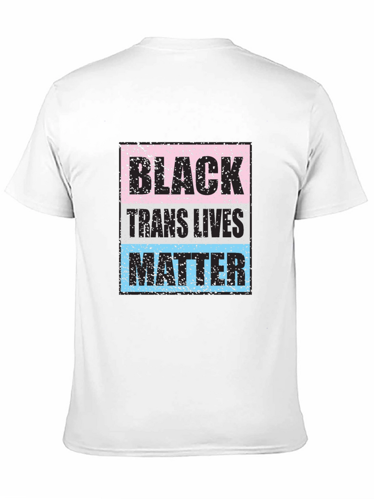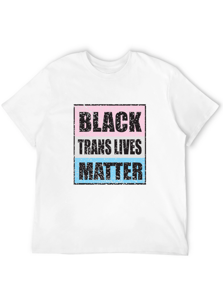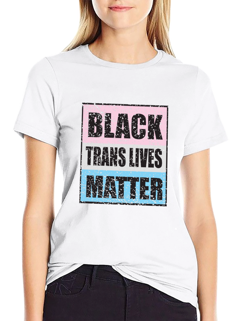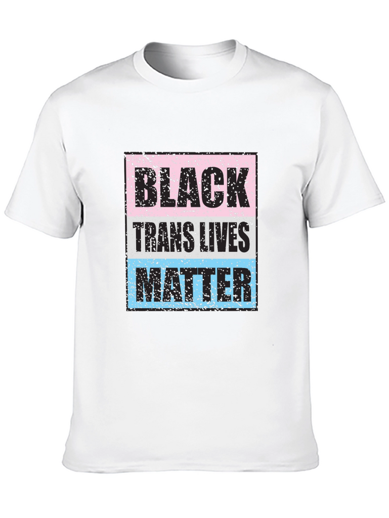 Show your support with this powerful statement tee. This black unisex t-shirt features a bold "Black Trans Lives Matter" design, utilizing the colors of the transgender pride flag. The distressed print gives it a unique, edgy look. Made from what appears to be a soft and comfortable fabric, this tee is perfect for everyday wear, rallies, or casual outings. Make a statement and spread awareness with this impactful and stylish t-shirt.