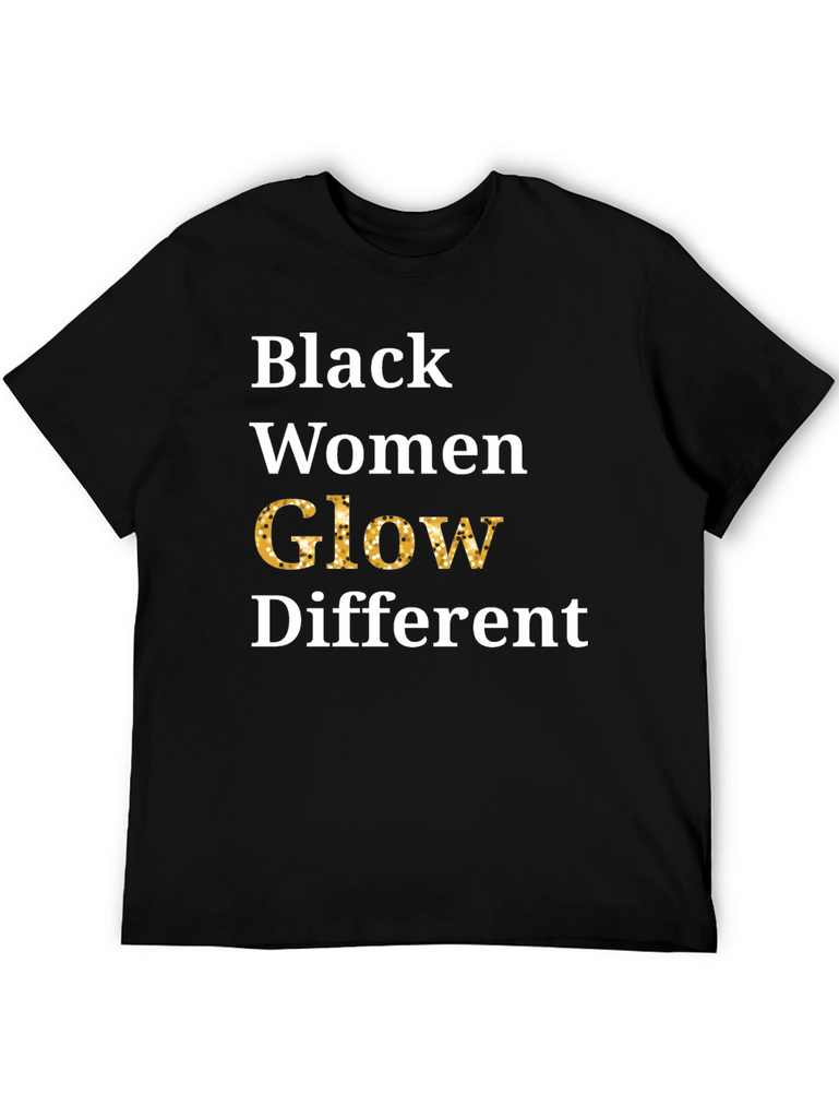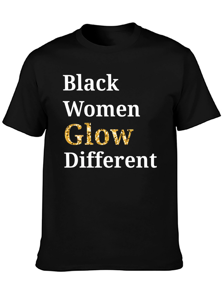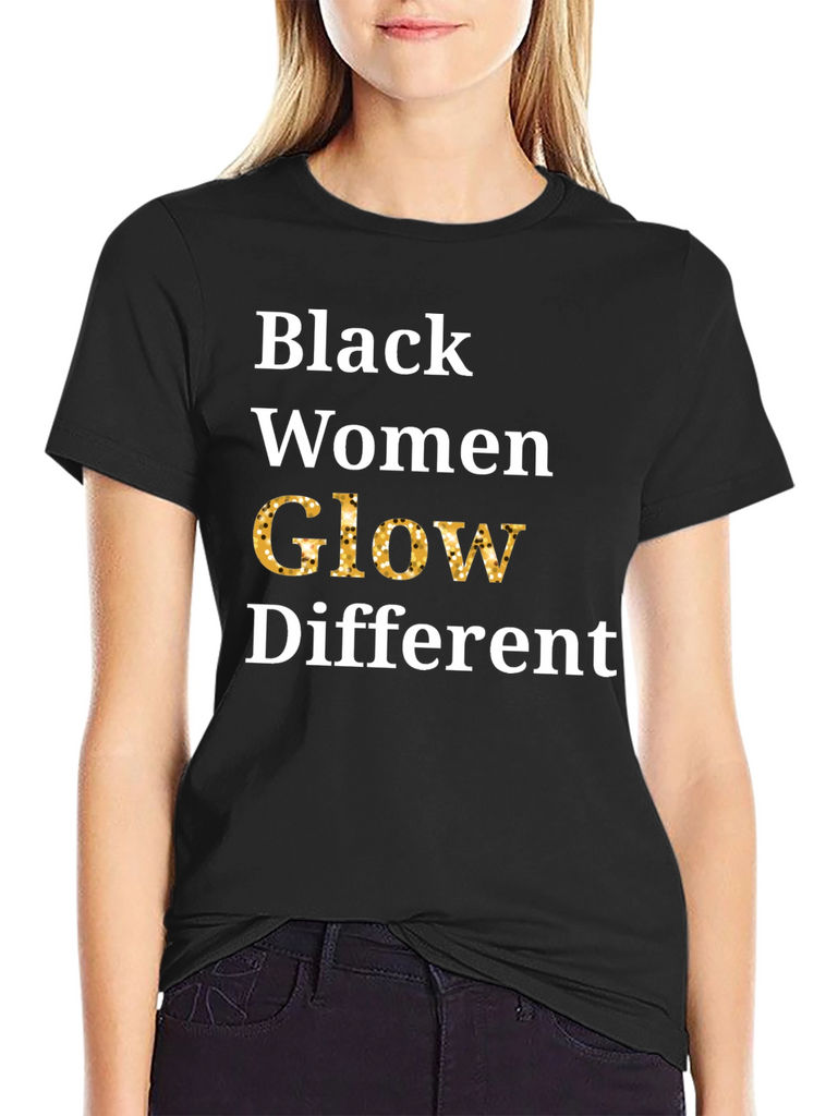 Express yourself with this stylish black t-shirt featuring the empowering statement "Black Women Glow Different." The design boasts a bold, white font for "Black Women" and "Different," while "Glow" is rendered in a shimmering, golden hue, adding a touch of glamour. Made from a comfortable fabric, this shirt is perfect for casual wear or making a statement at events. Show your pride and confidence with this eye-catching and meaningful design. Ideal for everyday wear, social gatherings, or as a thoughtful gift. This tee combines comfort, style, and a powerful message. Accessorize it to create different look!