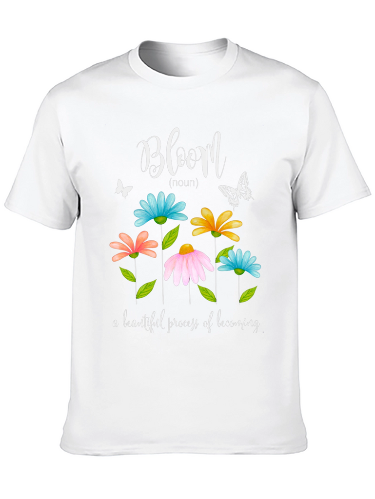 Embrace positivity with this charming black graphic t-shirt. Featuring a vibrant floral design with the word "Bloom," this shirt is perfect for adding a touch of inspiration to your wardrobe. The colorful flowers and delicate butterfly accents create a cheerful and uplifting aesthetic. Made from soft, comfortable fabric, it's ideal for everyday wear. Show off your style with this motivational piece that encourages growth and beauty. This tee is great for casual outings, nature lovers, or anyone seeking a reminder of the beauty of becoming. A must-have addition to any wardrobe!