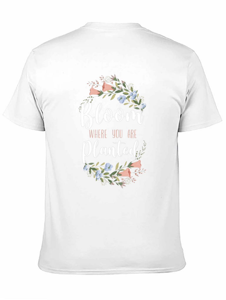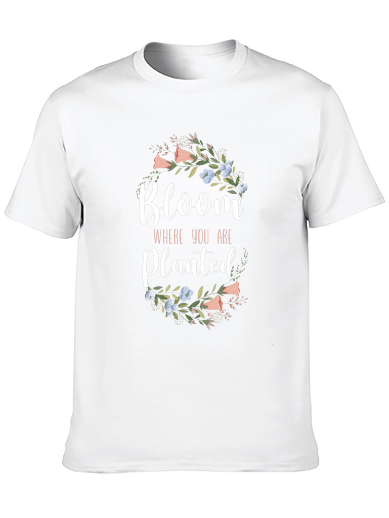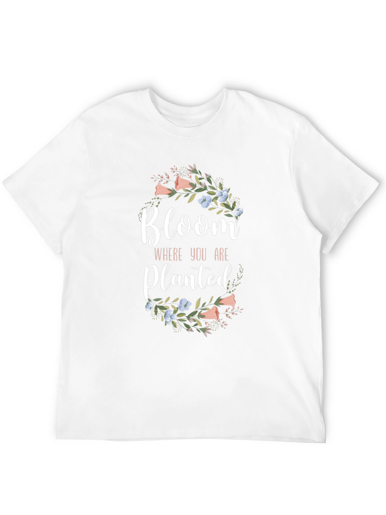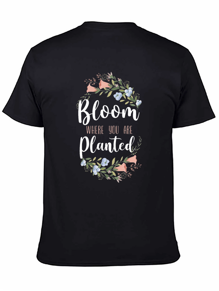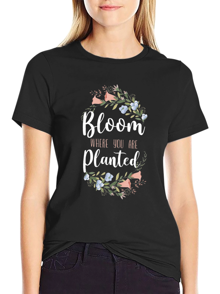 This stylish black t-shirt features a beautiful floral design with the inspiring message "Bloom Where You Are Planted." The design incorporates delicate flowers and greenery, creating a visually appealing and uplifting aesthetic. Made from comfortable material, this tee is perfect for everyday wear and makes a great conversation starter. Wear it while gardening, running errands, or just relaxing at home. Show off your positive attitude and inspire others with this unique and meaningful shirt. It's a wonderful gift for anyone who needs a little encouragement to thrive wherever they are!