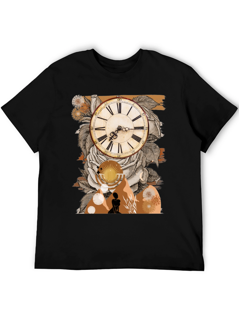 This stylish black t-shirt features a unique bohemian-inspired graphic design. The focal point is a vintage-style clock surrounded by detailed roses. A silhouette of a woman in a landscape with a rising sun design adds an artistic touch. The tee is made from a comfortable fabric, perfect for everyday wear. Its versatile design makes it ideal for casual outings, layering, or expressing your individual style. Stand out with this eye-catching piece that blends vintage charm with modern aesthetics. Great for those who appreciate unique and artistic fashion.