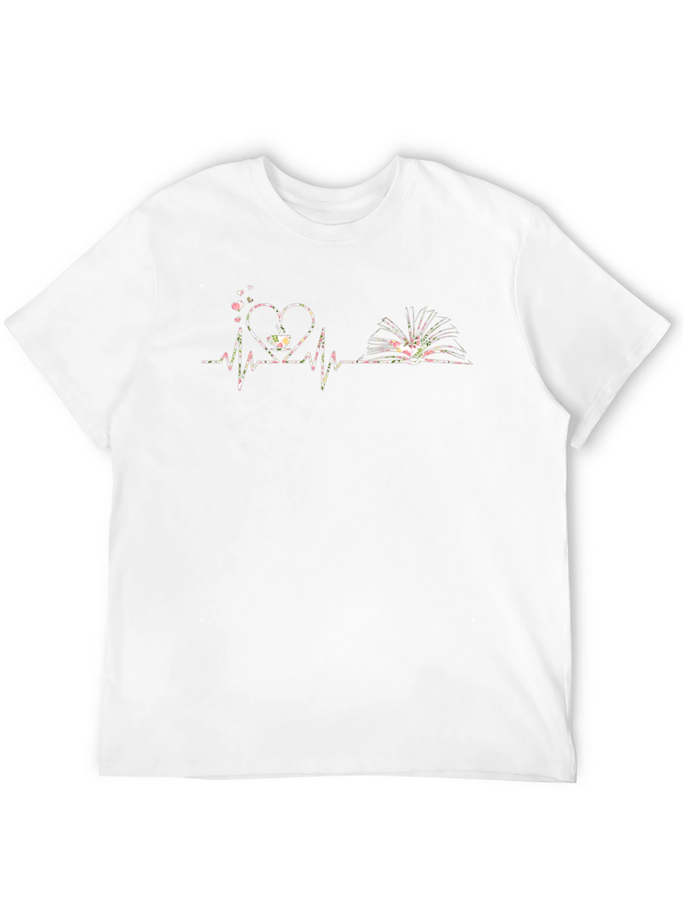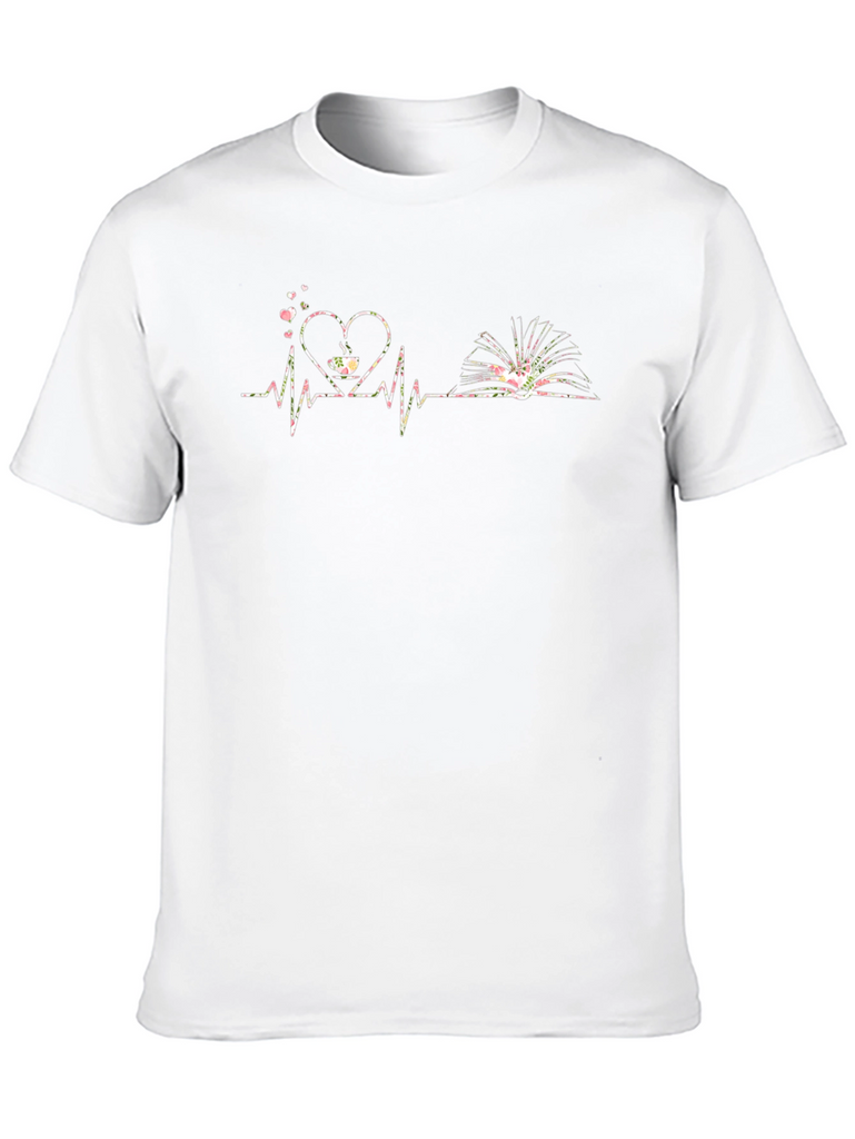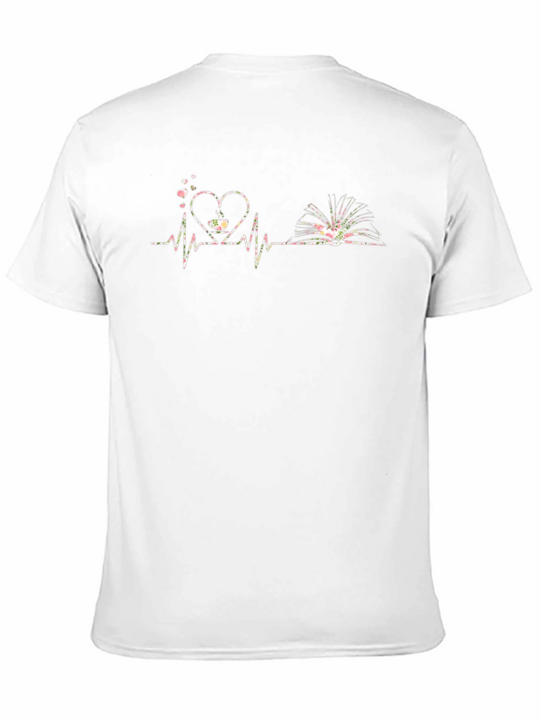 This stylish black t-shirt features a unique and eye-catching graphic print. The design showcases a heartbeat line incorporating a heart shape, a steaming coffee cup, and an open book, symbolizing a love for reading and coffee. The print has a colorful floral pattern. Made from comfortable, breathable fabric, this tee is perfect for everyday wear. Show off your passion for literature and caffeine with this expressive and trendy t-shirt. Ideal for casual outings, bookstore visits, or cozy reading sessions. Great gift for book lovers and coffee enthusiasts!