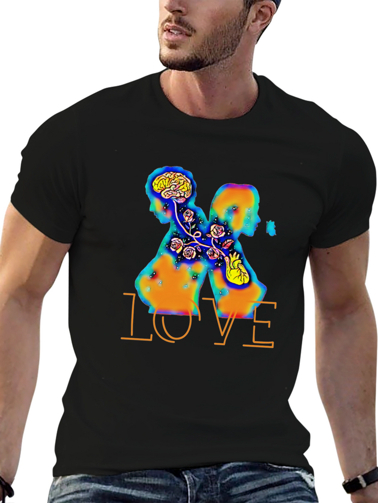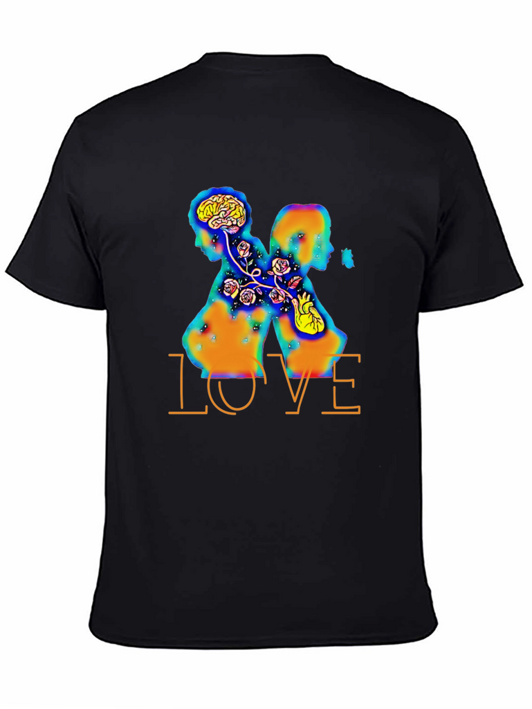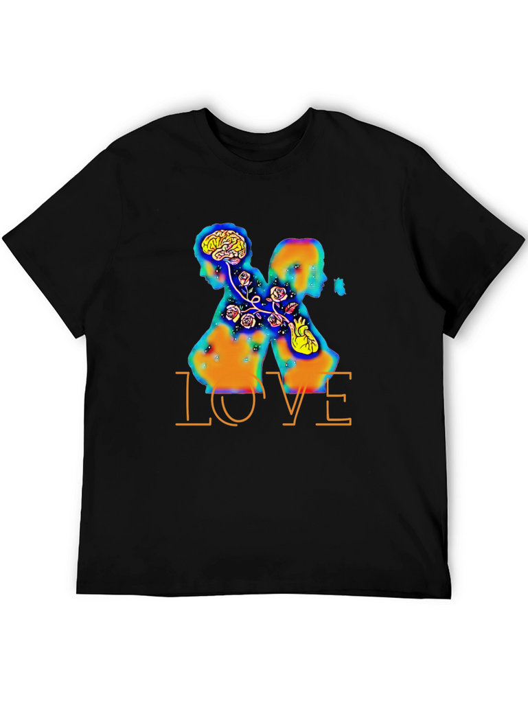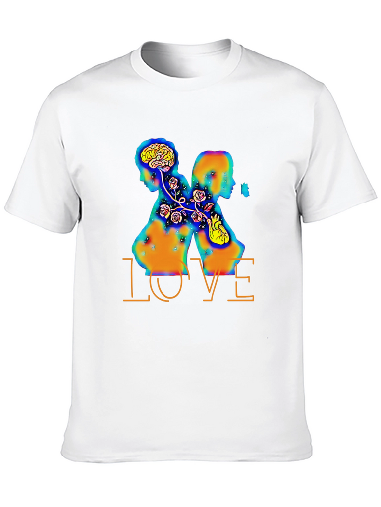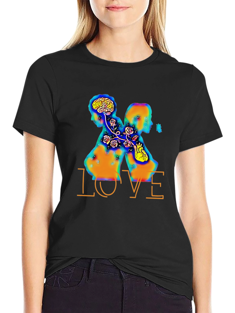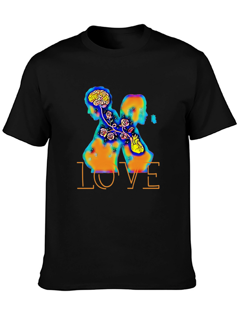 Show your love with this unique tee! Featuring a creative design, this black t-shirt showcases two silhouetted heads, one with a brain and the other with a heart, connected by roses. A visual representation of love, perfect for expressing emotions and individuality. Made from comfortable fabric for everyday wear. Ideal for casual outings, social gatherings, or simply expressing your unique style. This statement piece is a must-have for any wardrobe.