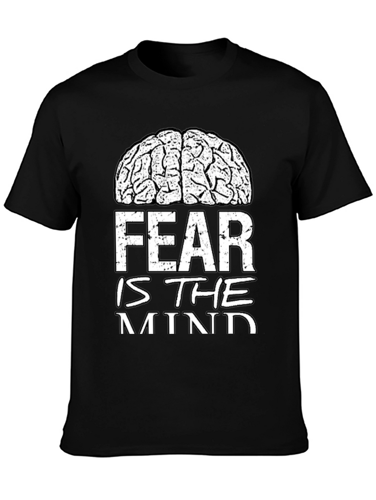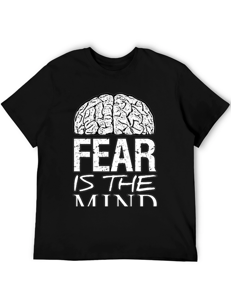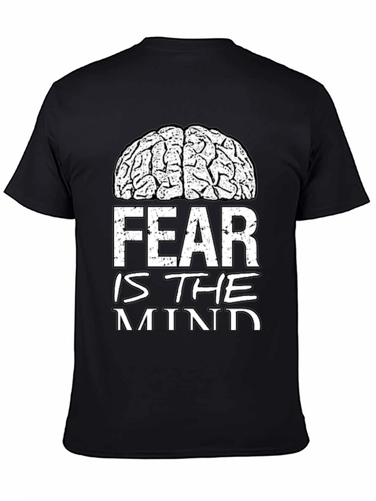 Show your intellectual side with this bold black t-shirt. The shirt features a white graphic of a brain above the phrase 'FEAR IS THE MIND'. The design is both striking and thought-provoking. Made from a soft-looking fabric, this tee offers comfort and durability for everyday wear. The design makes a statement while remaining versatile enough to pair with jeans or casual pants. Perfect for students, thinkers, or anyone who appreciates a unique graphic tee. Available in various sizes.