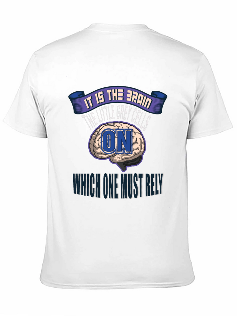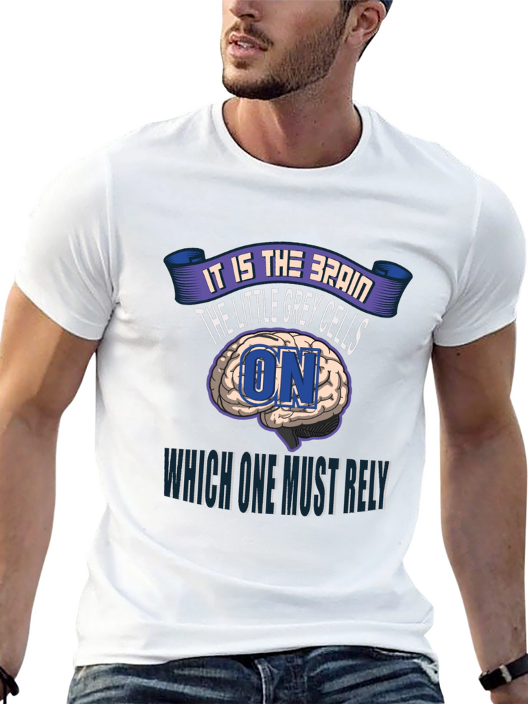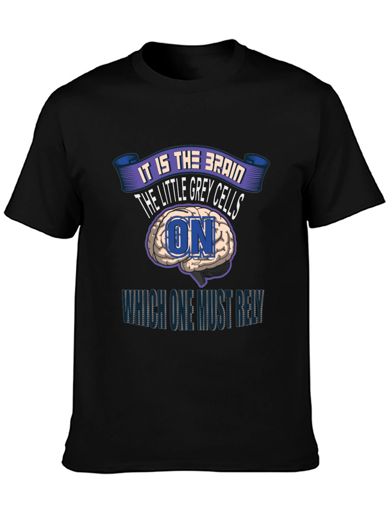 This eye-catching black t-shirt features a unique design centered around the brain and intellect. The print showcases a brain graphic with the text 'It is the Brain, the Little Grey Cells ON Which One Must Rely'. The design incorporates a playful yet thought-provoking message, making it ideal for those who appreciate intellectual humor and distinctive apparel. Made from what appears to be a soft and comfortable material, this tee offers both style and ease of wear. The classic crew neck and short sleeves ensure a relaxed fit, suitable for everyday wear or casual outings. Show off your love for all things brainy with this standout t-shirt!