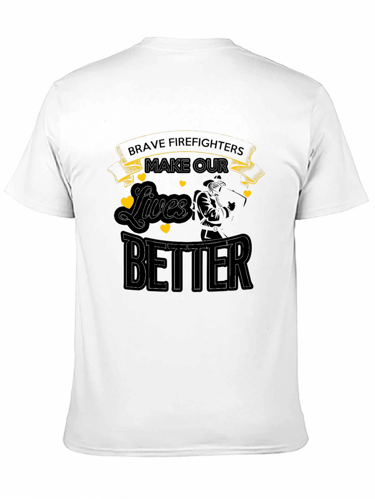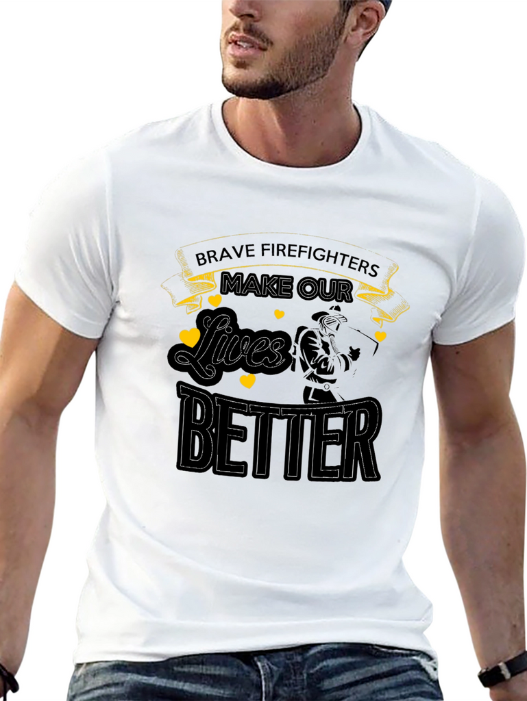 Show your support for the brave firefighters with this stylish black t-shirt. The design features a bold graphic that reads "Brave Firefighters Make Our Lives Better", complete with a firefighter silhouette and charming hearts. Made from a comfortable, breathable fabric, this tee is perfect for everyday wear. Its classic fit makes it suitable for all body types. Whether you're a firefighter, a family member, or simply an admirer, this shirt is a great way to express your appreciation. Wear it to community events, casual outings, or as a statement of solidarity. Get yours today and wear your support proudly!