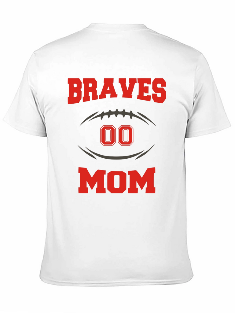 Show your team spirit with this stylish black t-shirt! Featuring a bold "BRAVES MOM" design, this shirt is perfect for any proud football mom. The design includes a football graphic with the number "00" in the middle. Made from comfortable material, this tee is ideal for game days, practices, or everyday wear. Let everyone know who you're rooting for with this eye-catching shirt!