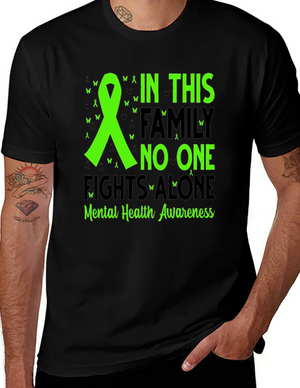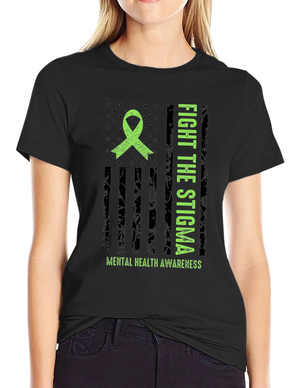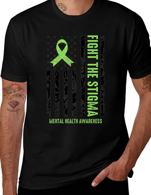Show your support with this impactful black t-shirt. The design features distressed white lettering that reads "BREAK THE STIGMA AROUND MENTAL HEALTH", accented by two symbolic ribbon graphics. Perfect for raising awareness and starting conversations. Made from a comfortable-looking fabric, this tee is suitable for everyday wear. Wear it to support mental health awareness events, show solidarity, or simply express your commitment to breaking down stigmas. A meaningful and stylish way to promote positive change.