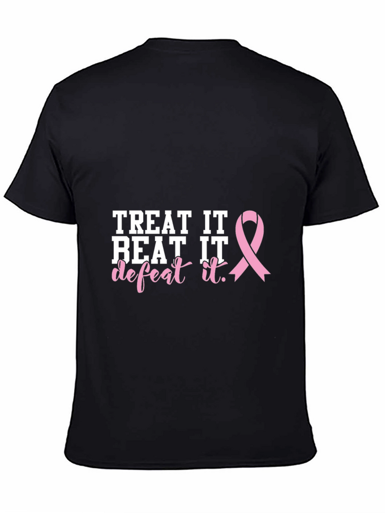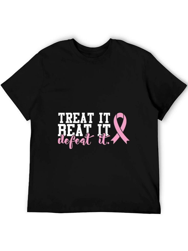 Show your support with this impactful black t-shirt, perfect for raising breast cancer awareness. The shirt features a bold design with the empowering message "Treat it, Beat it, Defeat it" alongside a pink breast cancer awareness ribbon. Made from a comfortable material, it's ideal for everyday wear. Wear it to support survivors, remember loved ones, or simply spread awareness. This shirt combines style and purpose, making it a meaningful addition to your wardrobe. Available in various sizes.
