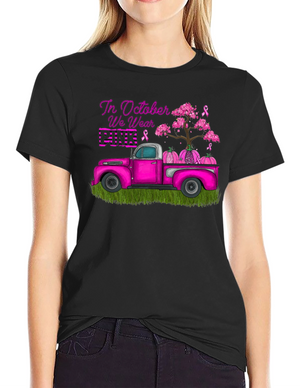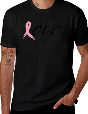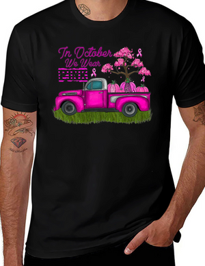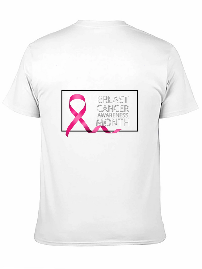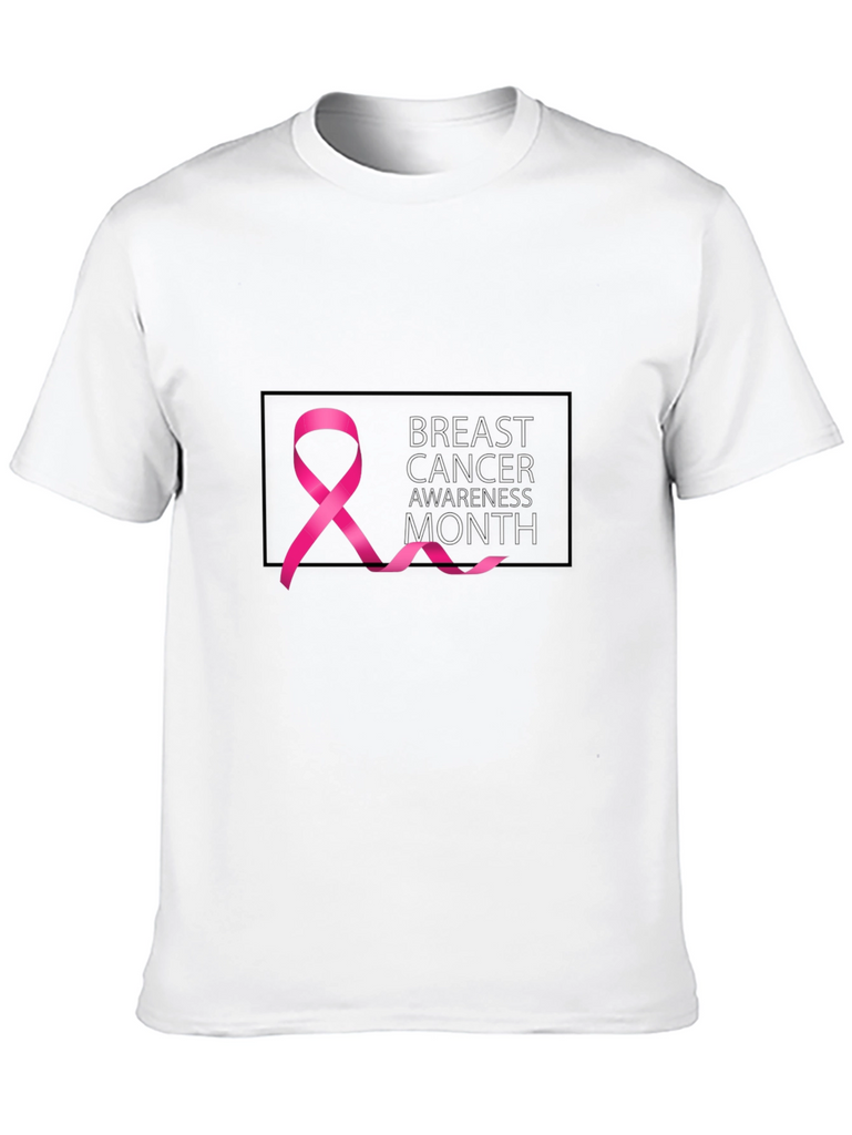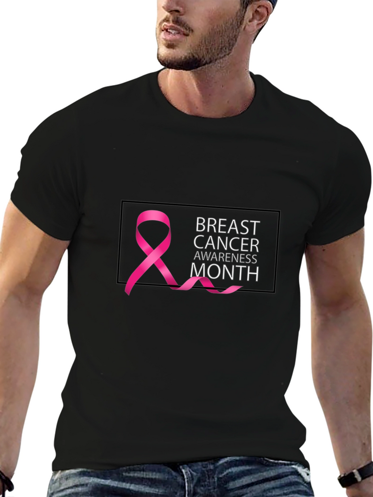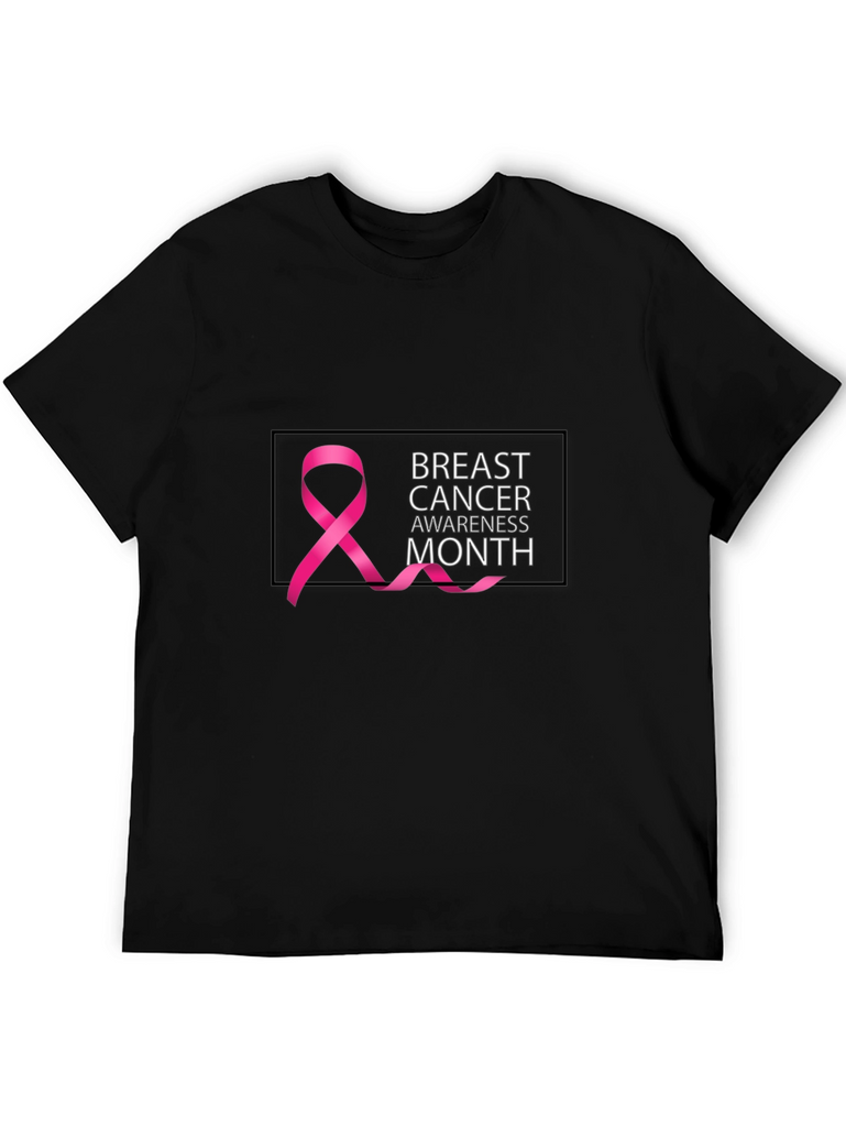 Show your support with this stylish black T-shirt featuring a pink ribbon and the words 'Breast Cancer Awareness Month.' The design is prominently displayed on the front of the shirt. Made from a soft, comfortable fabric, this shirt is perfect for raising awareness and starting conversations. Wear it to walks, events, or any day you want to show your solidarity. A meaningful and fashionable way to support a vital cause.