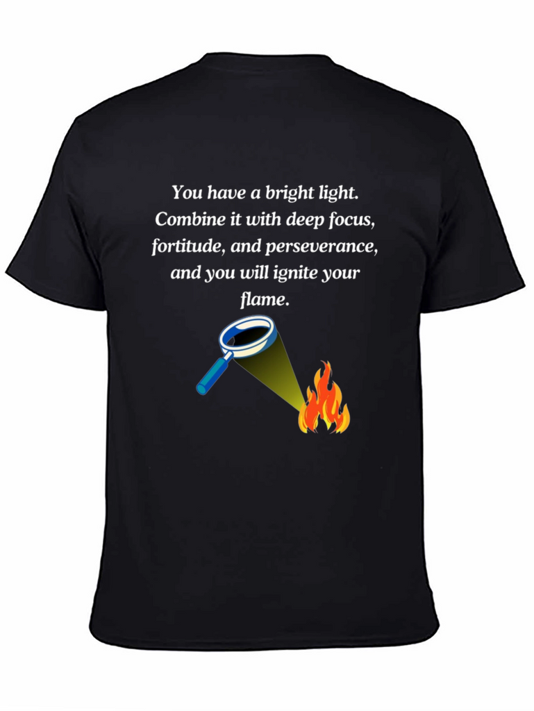 Ignite your inner fire with this striking black t-shirt. Featuring a bold graphic design, the shirt displays an inspiring message: "You have a bright light. Combine it with deep focus, fortitude, and perseverance, and you will ignite your flame." A magnifying glass focuses a beam of light to start a flame, visually reinforcing the message. Made from comfortable material, this tee is perfect for everyday wear, casual outings, or as a motivational statement piece. Ideal for those seeking inspiration or looking to express their drive and determination. Get yours today!