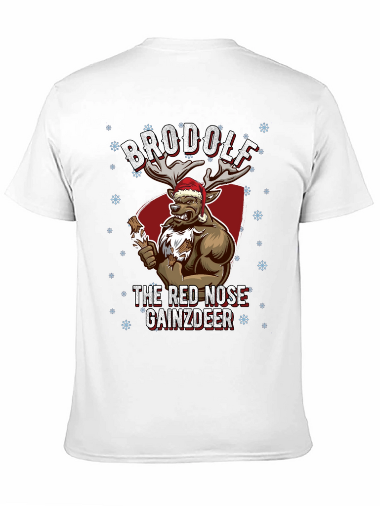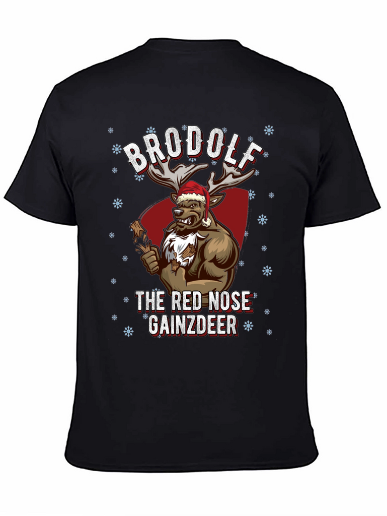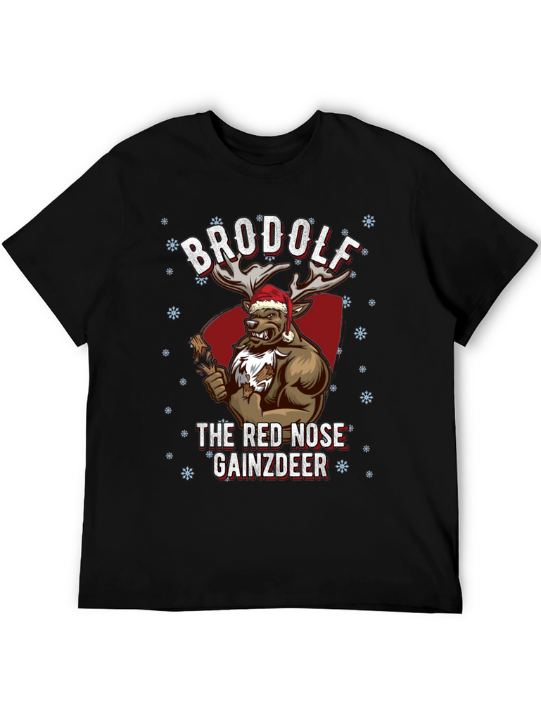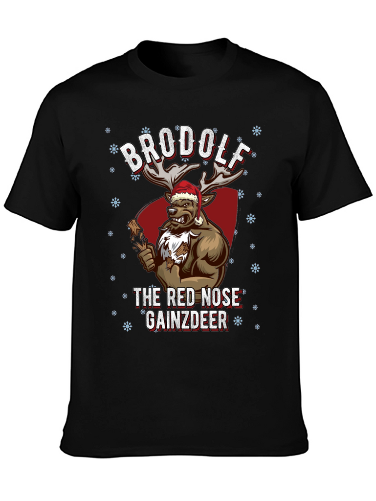 This black t-shirt features a unique and humorous design, perfect for the holiday season with a twist. The graphic displays a muscular reindeer, wearing a Santa hat and holding a wooden club. Above the reindeer, the text reads "BRODOLF" in a festive font, and below, it says "THE RED NOSE GAINZDEER," playing on the classic Christmas character. The design is surrounded by snowflake accents, adding to the seasonal feel. Made from a soft-looking fabric, this shirt offers both comfort and style. Wear it to holiday parties, gym sessions, or as a fun everyday statement piece.