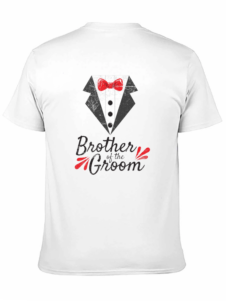 Celebrate the special occasion with this stylish "Brother of the Groom" T-shirt. The design features a tuxedo graphic with a red bow tie, giving a playful nod to formal attire. Made from comfortable material, this T-shirt is perfect for the wedding rehearsal dinner, reception, or casual pre-wedding festivities. Show your support and stand out with this unique and memorable piece of apparel. It is sure to spark conversations and add a touch of fun to the celebration. Get yours today and wear your role with pride!