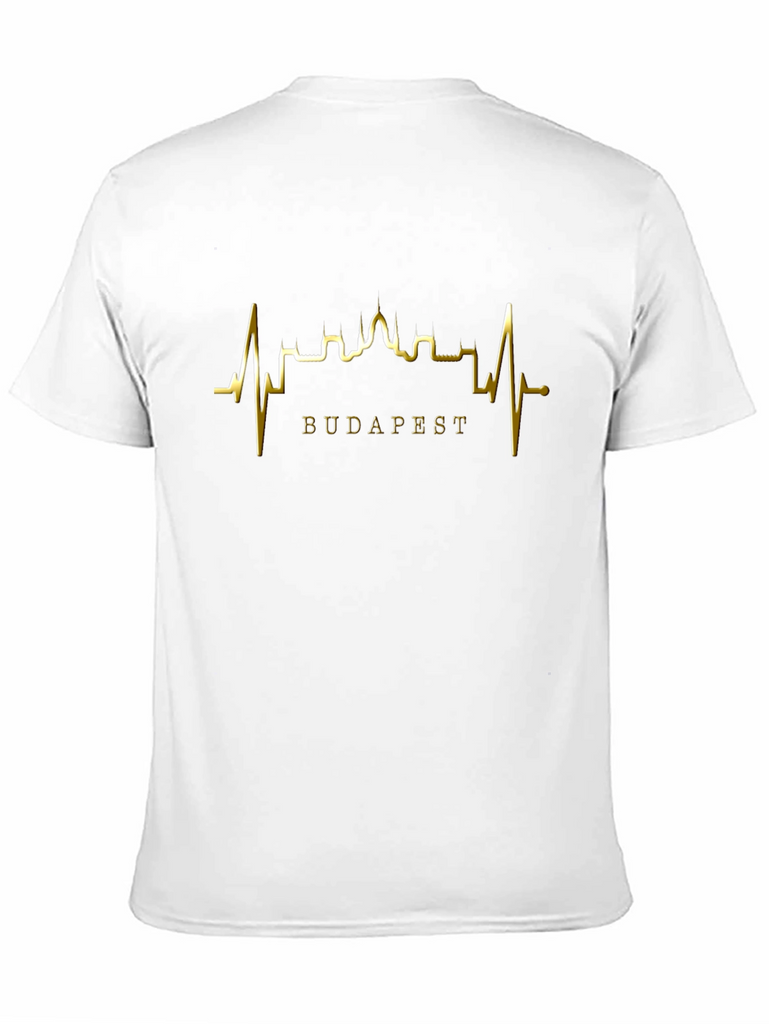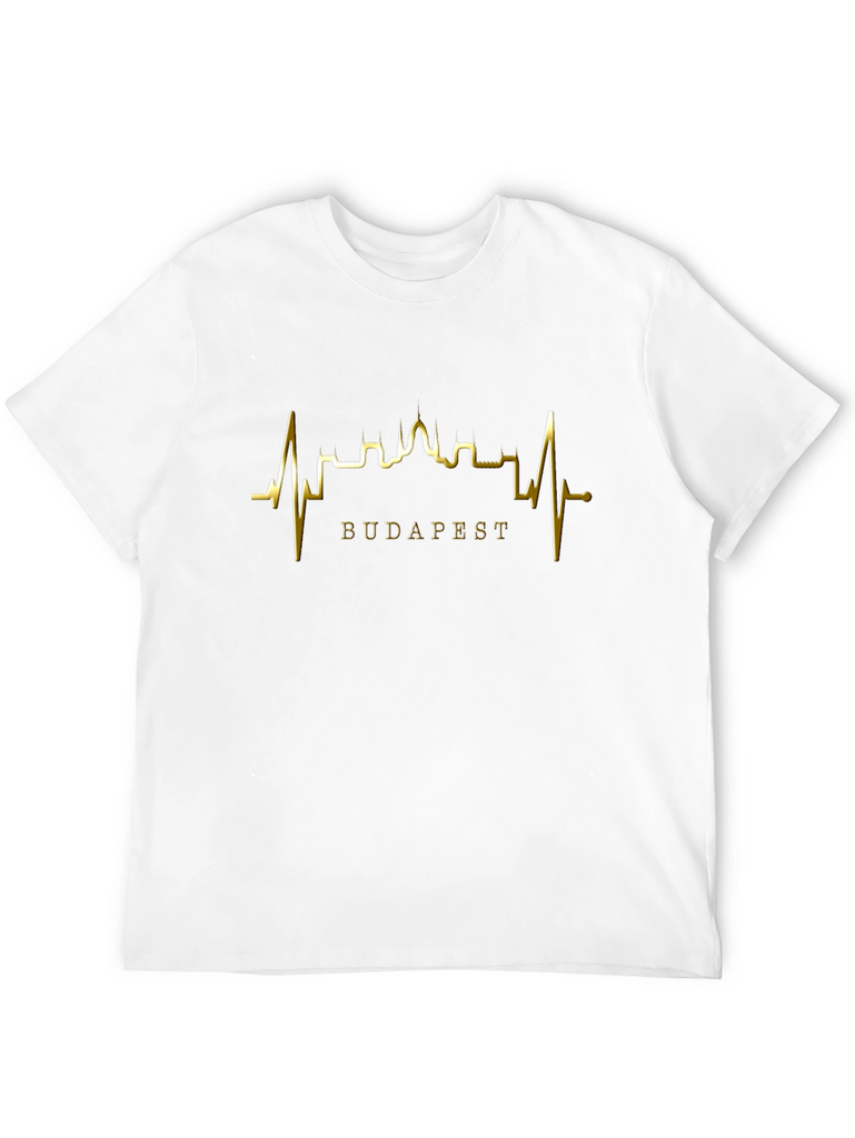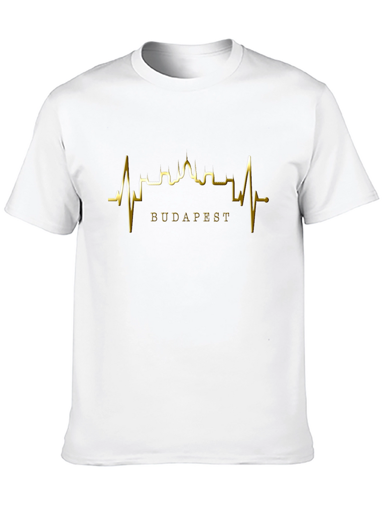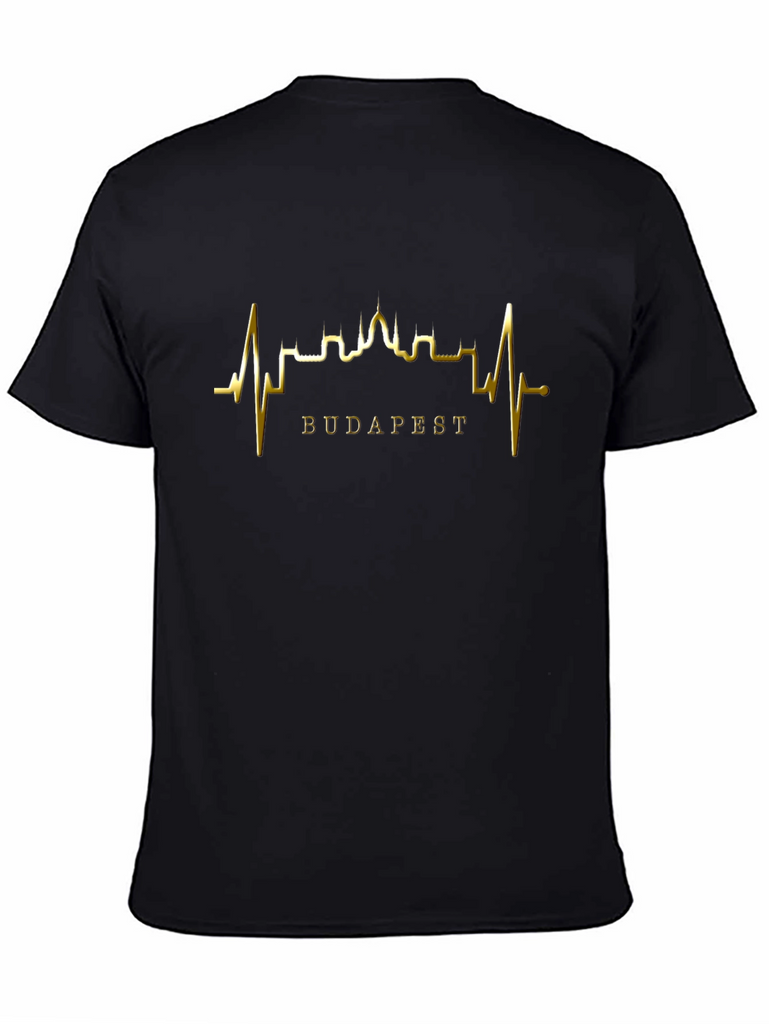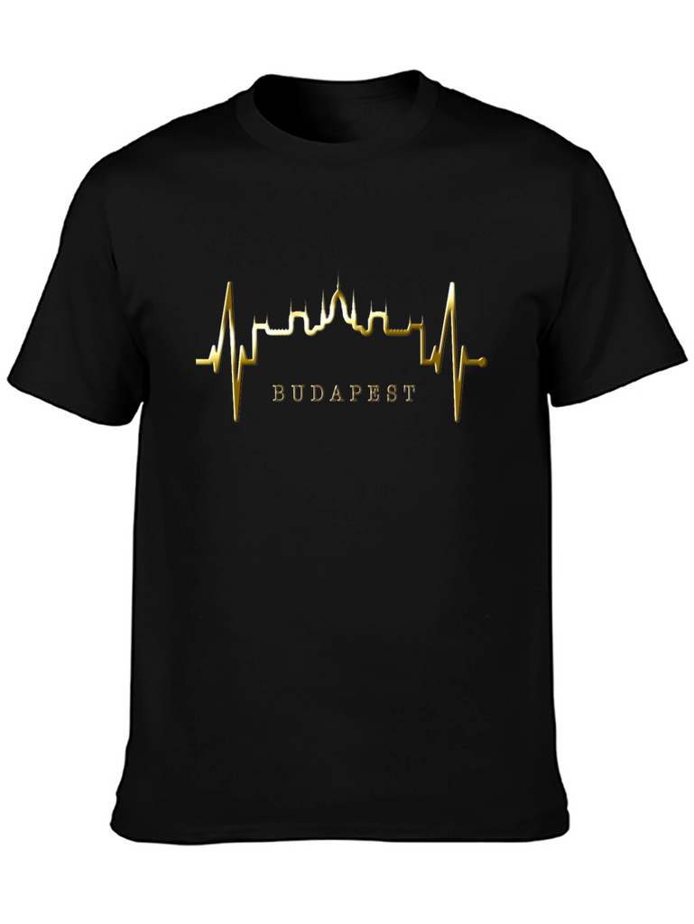 Show your love for Budapest with this stylish black t-shirt! Featuring a unique golden graphic design that combines the city skyline with a heartbeat line, this tee is perfect for travelers, Budapest natives, or anyone who appreciates modern design. Made from soft and comfortable material, it's great for everyday wear. Stand out with this eye-catching and trendy Budapest tee! A unique gift idea for those who love Budapest.