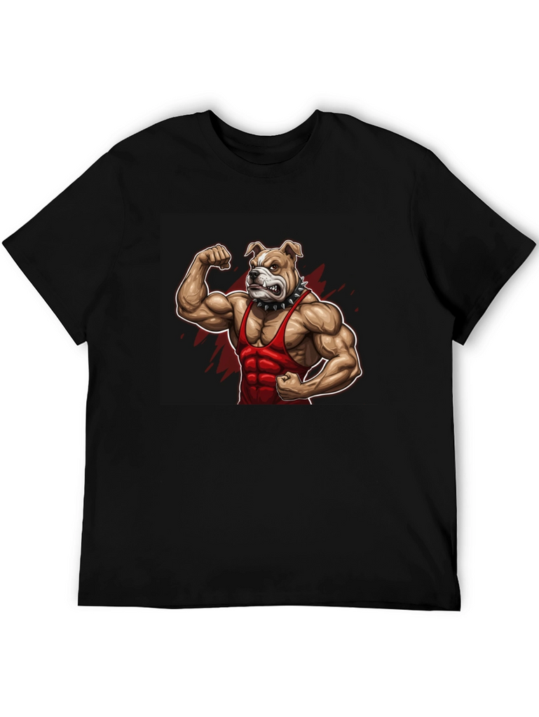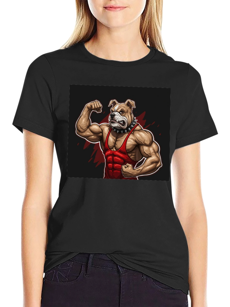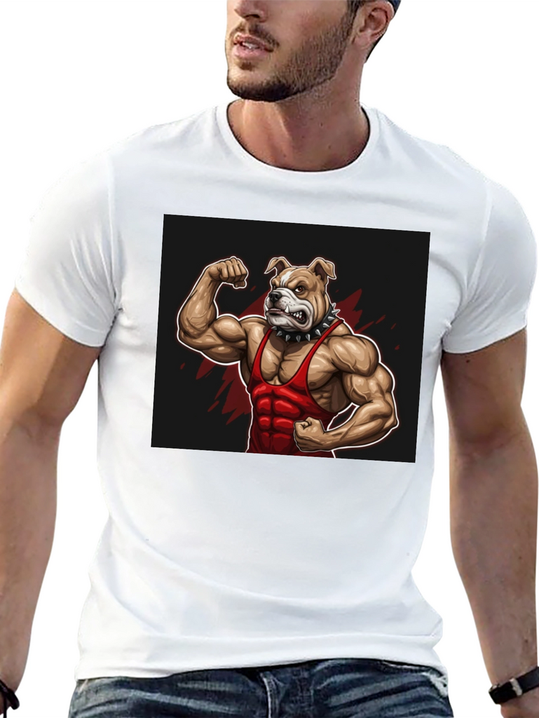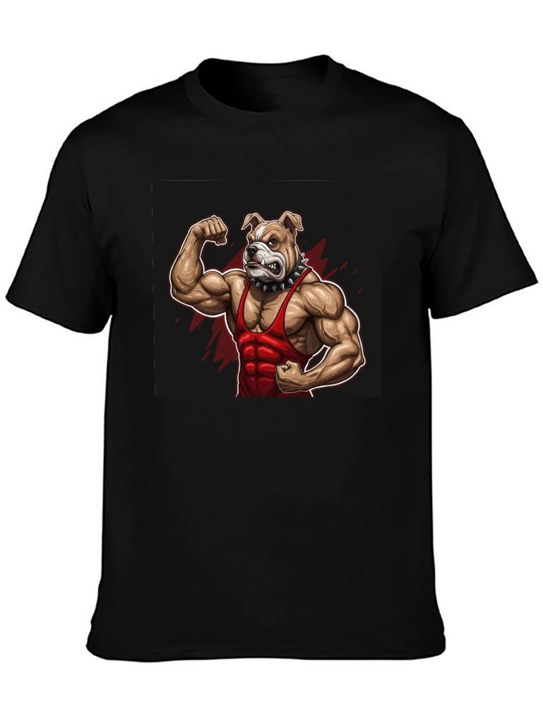 Unleash your inner beast with this bold black t-shirt! Featuring a striking graphic of a muscular bulldog flexing in a red tank top, this tee makes a powerful statement. The high-quality print showcases intricate details, from the dog's intense expression to the defined musculature. Made from comfortable, breathable fabric, this t-shirt is perfect for workouts, casual outings, or making a statement wherever you go. Show off your strength and unique style with this eye-catching design. Get yours today and let your personality shine!