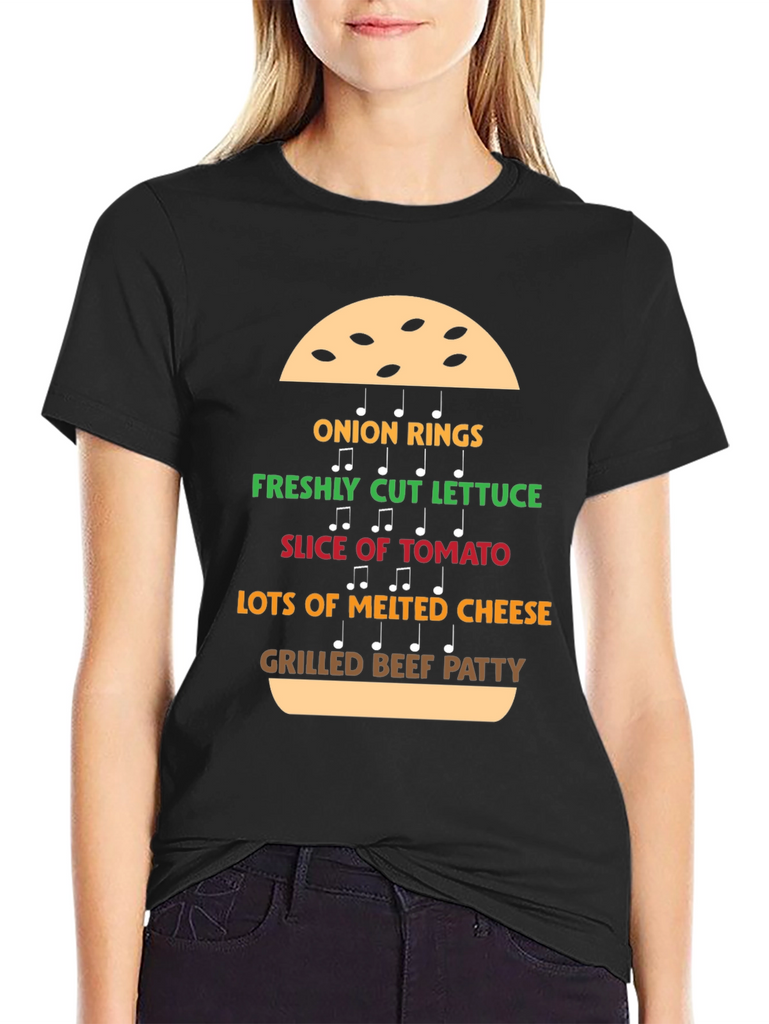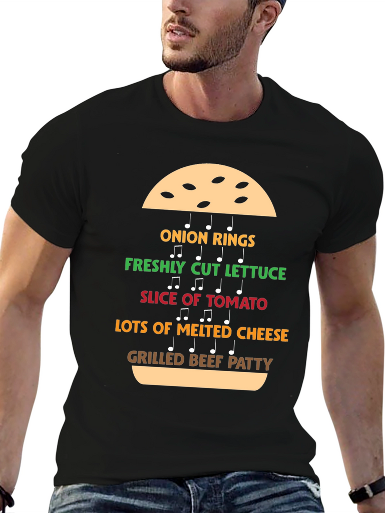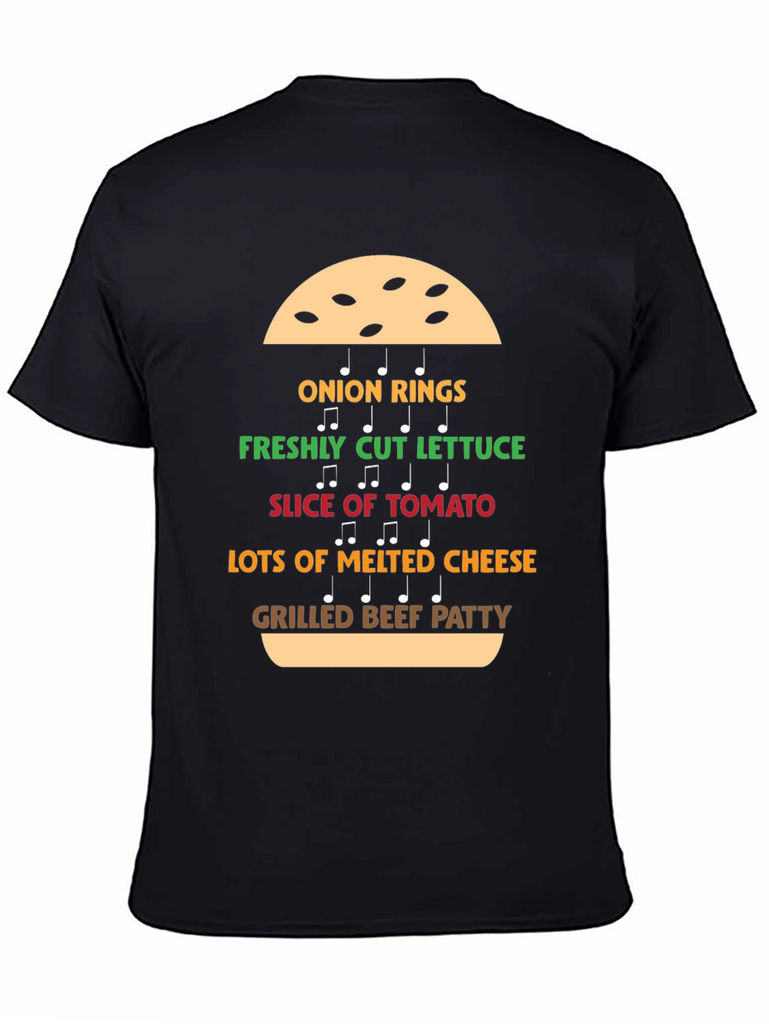 This eye-catching black T-shirt features a fun and unique design depicting the deconstructed ingredients of a burger, presented as musical notes. Each ingredient is labeled in a corresponding vibrant color: onion rings, freshly cut lettuce, slice of tomato, lots of melted cheese, and grilled beef patty. The playful design will be a hit for burger lovers. Made from a soft, comfortable material, this tee is perfect for casual wear. Show off your love for delicious burgers with this stylish tee. Great for parties, cookouts, or everyday fun!