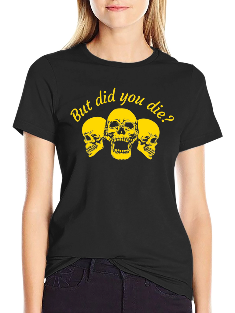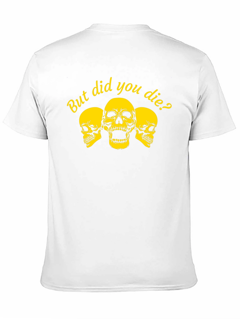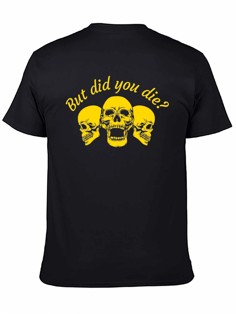 Show off your adventurous spirit with this bold black tee. Featuring a striking yellow graphic of three skulls and the playful phrase 'But Did You Die?', this shirt is perfect for those who live life to the fullest. The classic crew neck and comfortable fit make it ideal for everyday wear, while the eye-catching design is sure to spark conversation. Whether you're hitting the gym, hanging out with friends, or exploring the great outdoors, this tee is a stylish way to express your fearless attitude. Makes a great gift for adrenaline junkies!