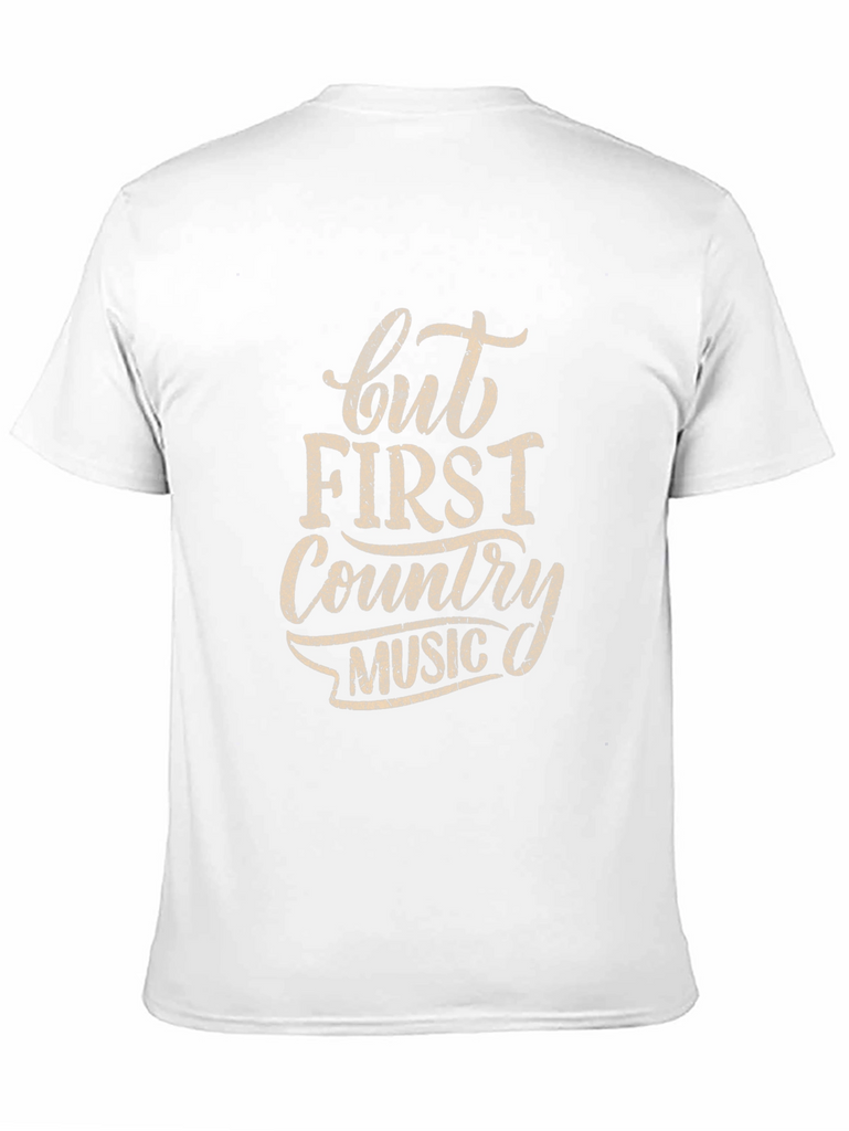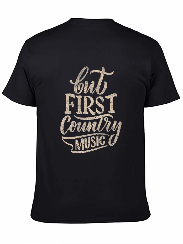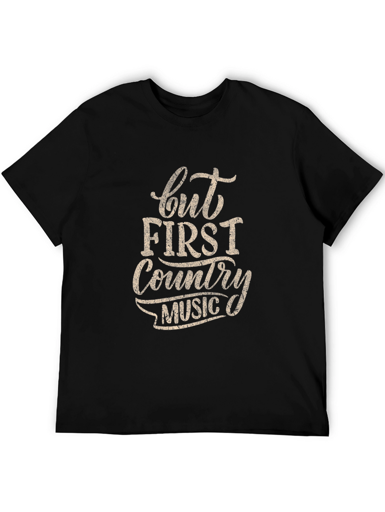 Show off your love for country music with this stylish black tee. The shirt features a distressed-style graphic that reads "but FIRST Country MUSIC." Made from what appears to be a comfortable cotton blend, this tee is perfect for casual wear. The design makes it ideal for concerts, casual hangouts, or everyday wear, making it a versatile addition to any wardrobe. Grab this tee and let everyone know you're a country music fan!