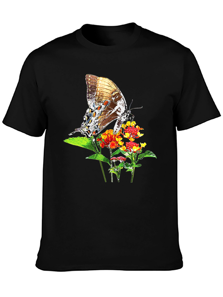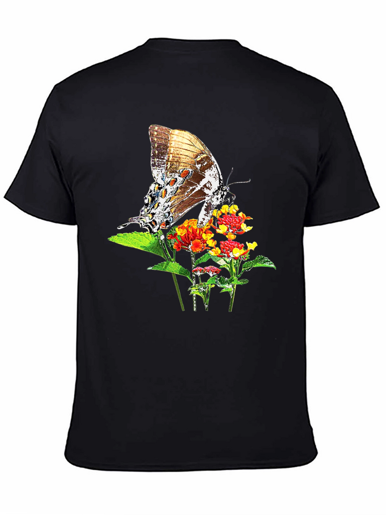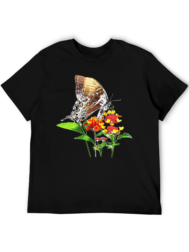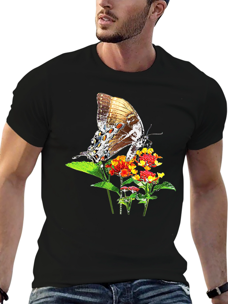 Show off your love for nature with this eye-catching black T-shirt. Featuring a detailed graphic of a butterfly resting on vibrant flowers, this tee adds a pop of color and personality to any outfit. Made from a comfortable, breathable fabric, it's perfect for everyday wear. The design is printed with high-quality inks for long-lasting vibrancy. Whether you're exploring the outdoors or just hanging out with friends, this unique T-shirt is sure to turn heads. Get yours today and make a statement!