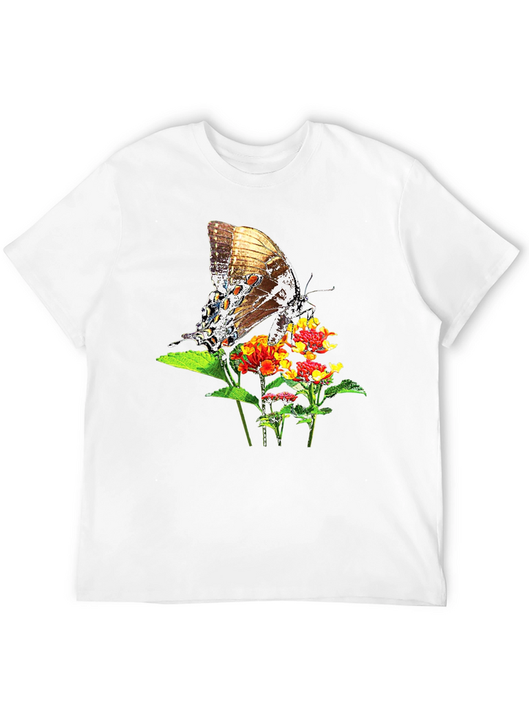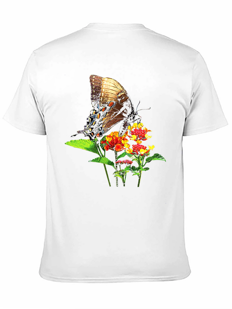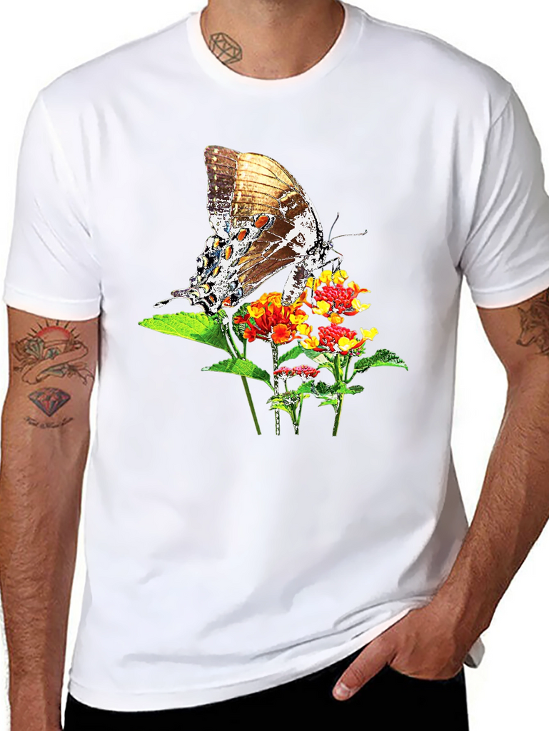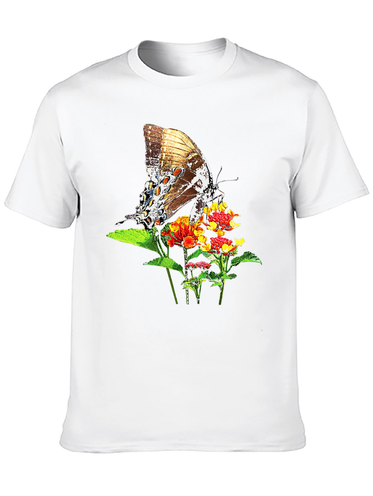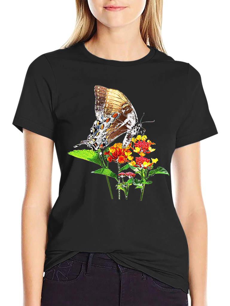 Show off your love for nature with this eye-catching black T-shirt. Featuring a detailed graphic of a butterfly resting on vibrant flowers, this tee adds a pop of color and personality to any outfit. Made from a comfortable, breathable fabric, it's perfect for everyday wear. The design is printed with high-quality inks for long-lasting vibrancy. Whether you're exploring the outdoors or just hanging out with friends, this unique T-shirt is sure to turn heads. Get yours today and make a statement!