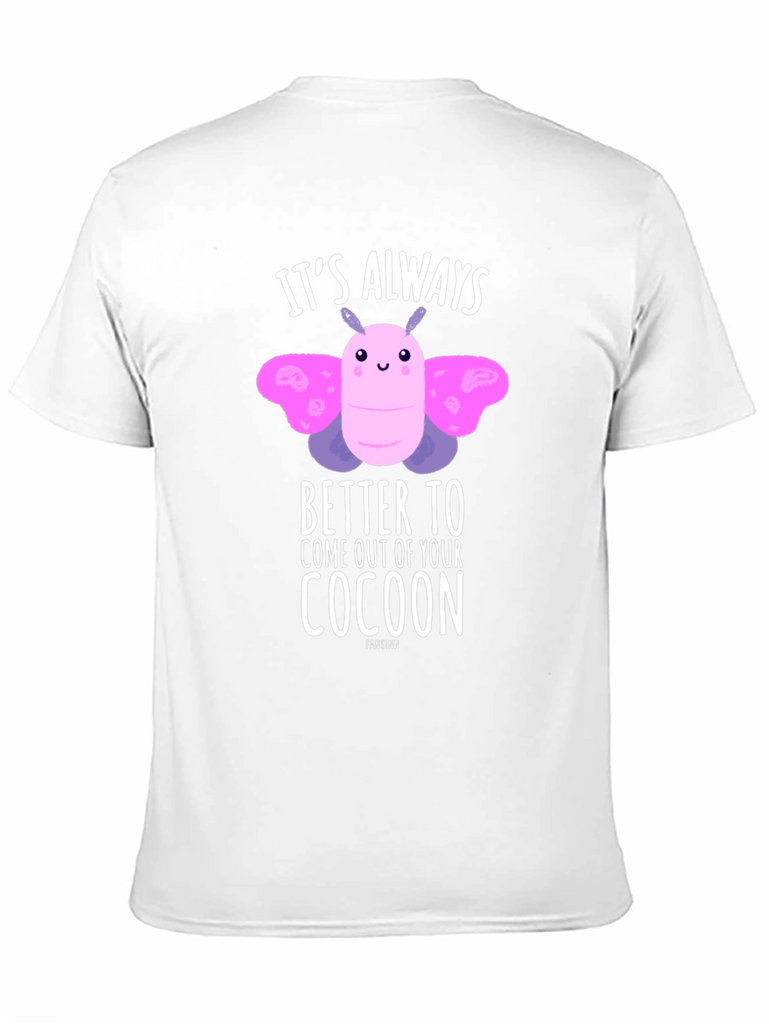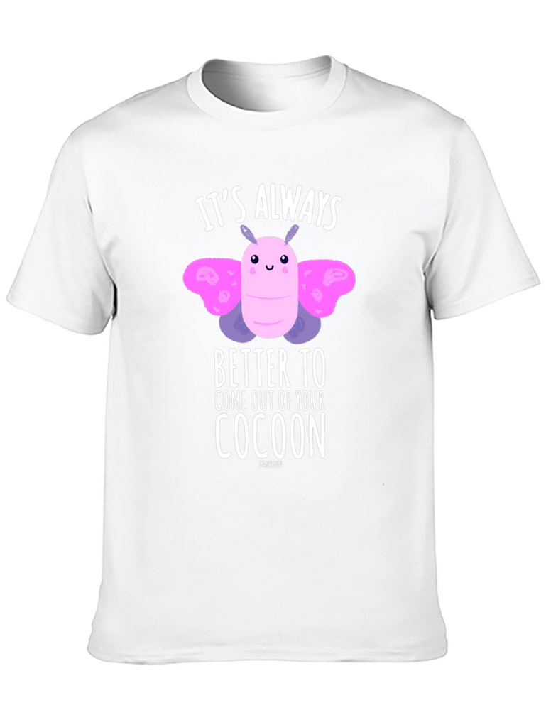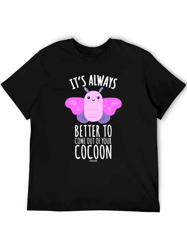 Embrace your inner butterfly with this unique black t-shirt! The design features a cute butterfly graphic, accompanied by the inspiring message "It's Always Better to Come Out of Your Cocoon". Made from comfortable materials, this tee is perfect for everyday wear. Show off your optimistic side and inspire others with this motivational t-shirt. Ideal for casual outings, weekend adventures, or simply lounging at home. Let this shirt be a reminder to always spread your wings and be yourself!