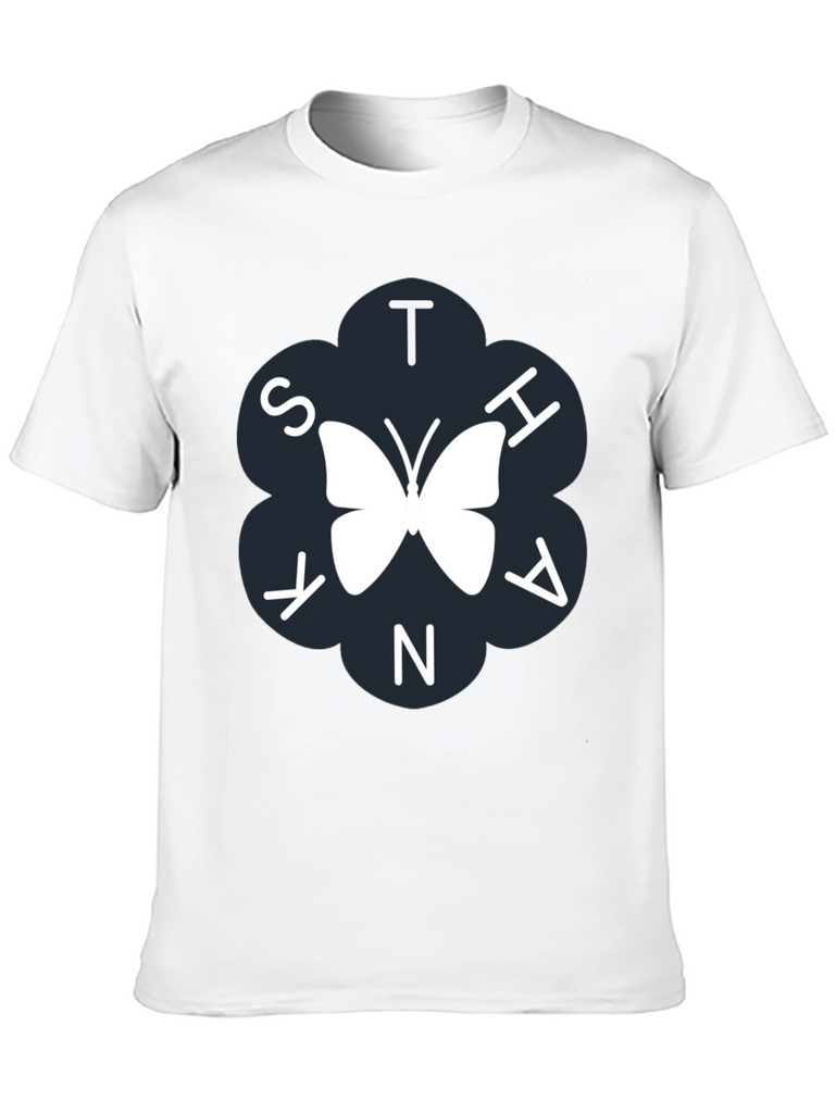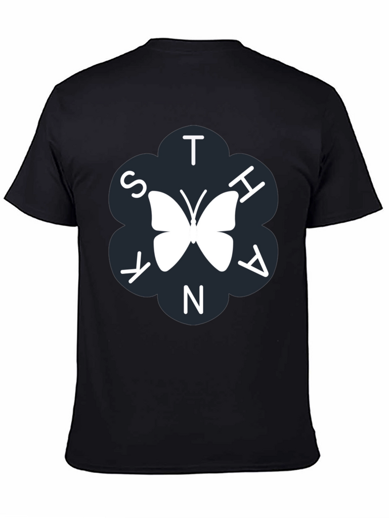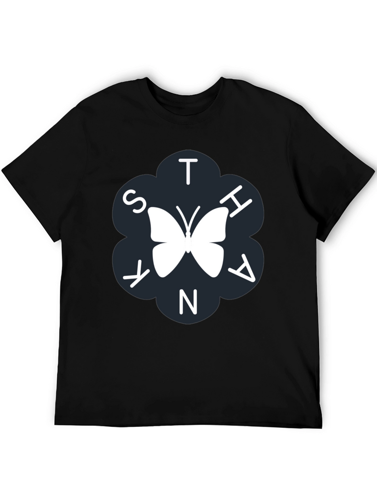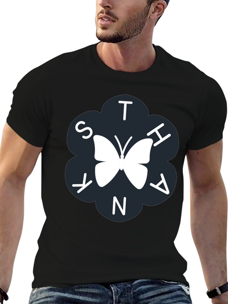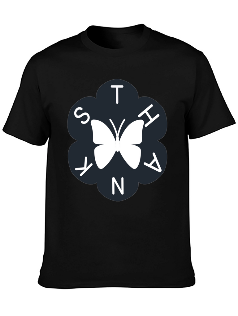 Elevate your casual wardrobe with this striking black t-shirt. The design features a unique butterfly surrounded by the letters "THANAK" inside a flower shape. This soft and breathable shirt is perfect for everyday wear, providing both comfort and style. Wear it out on the town or lounging at home. This shirt is versatile and will surely become a favorite.