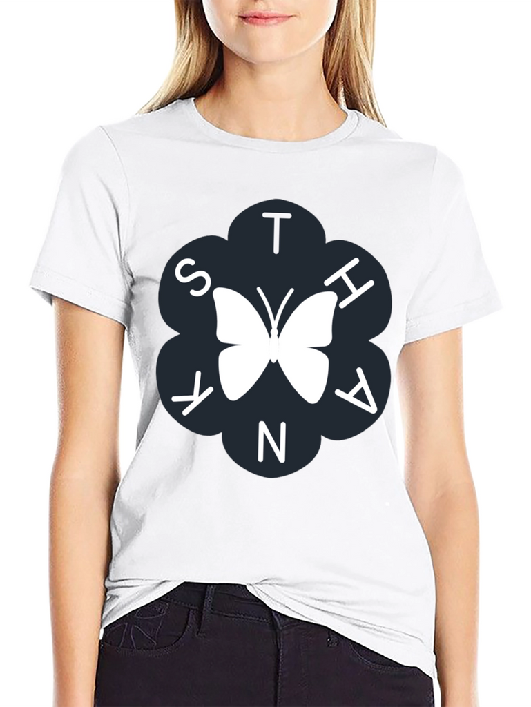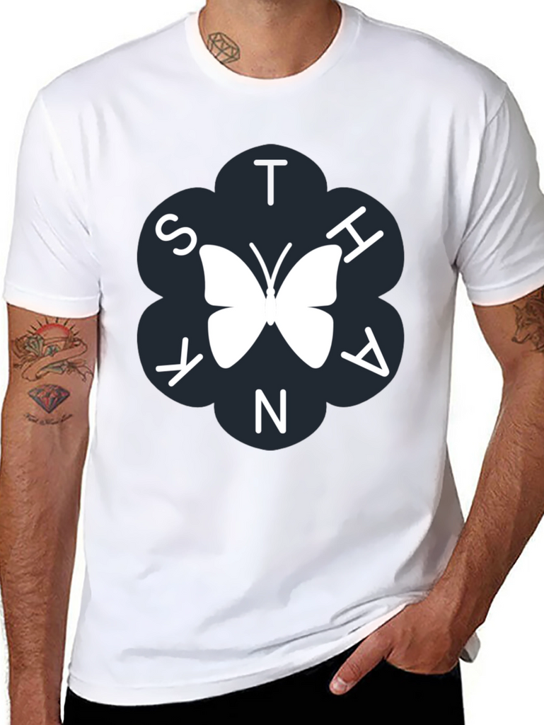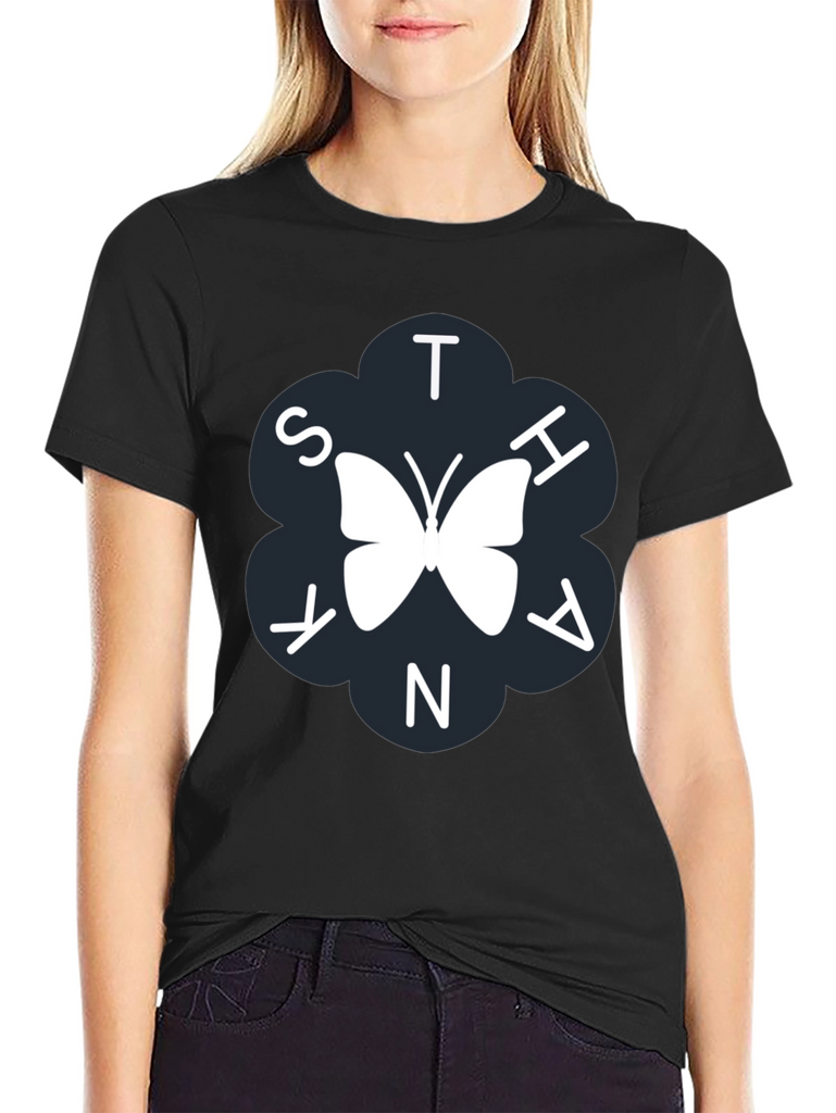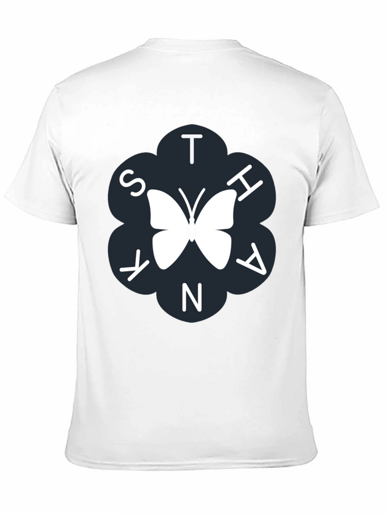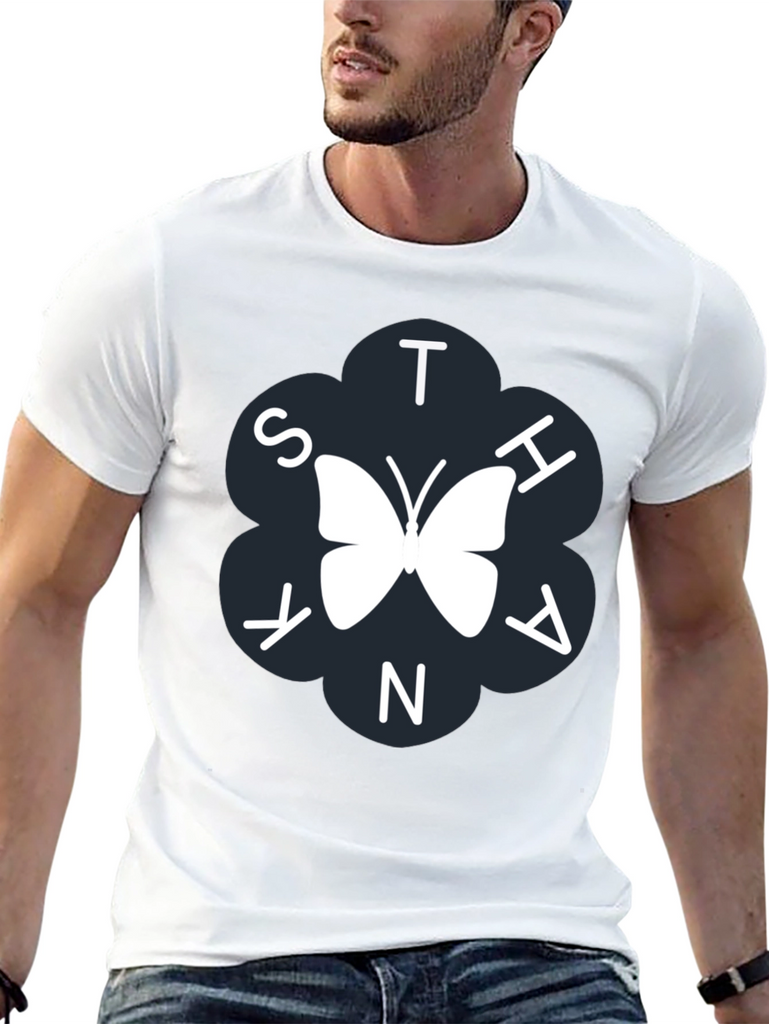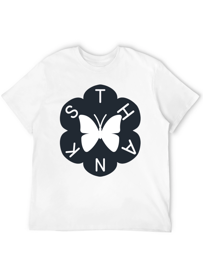 Elevate your casual wardrobe with this striking black t-shirt. The design features a unique butterfly surrounded by the letters "THANAK" inside a flower shape. This soft and breathable shirt is perfect for everyday wear, providing both comfort and style. Wear it out on the town or lounging at home. This shirt is versatile and will surely become a favorite.