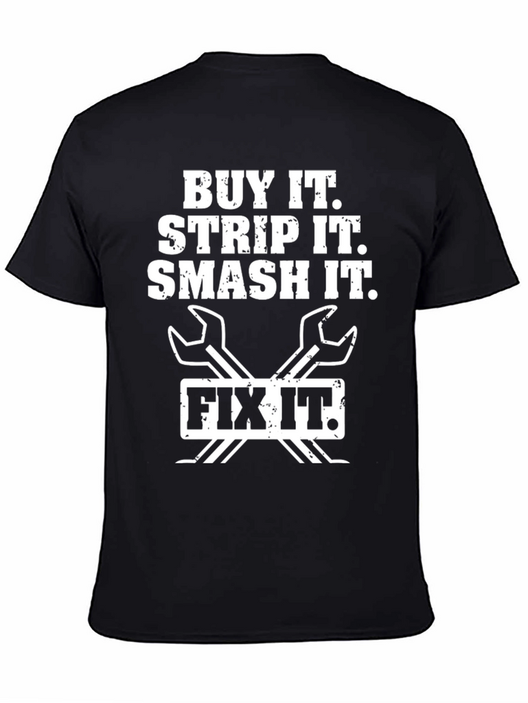Show off your love for fixing things with this eye-catching black t-shirt. This shirt features a bold white graphic design with the phrase "Buy It. Strip It. Smash It. Fix It." printed above crossed wrenches, making it a perfect conversation starter. Made from what appears to be a comfortable cotton blend, this t-shirt offers a classic fit that's ideal for everyday wear. Whether you're working in the garage, hanging out with friends, or simply want to express your passion for mechanics, this t-shirt is a great choice. The design is clean and the message is clear – a must-have for any DIY enthusiast or professional mechanic.