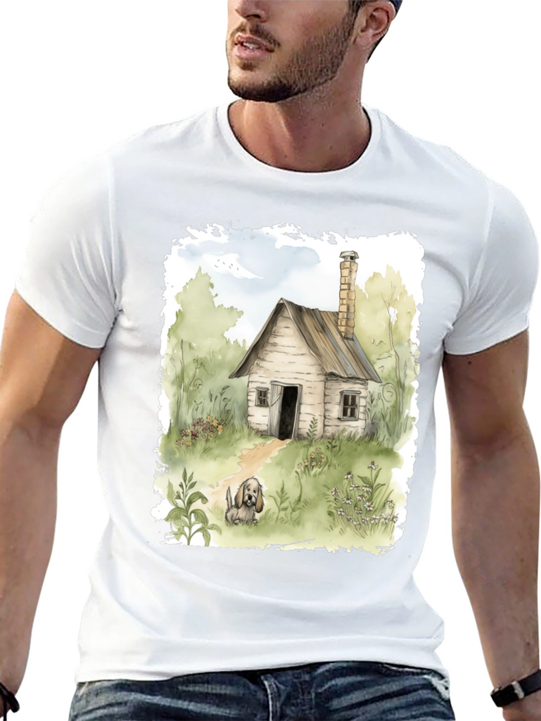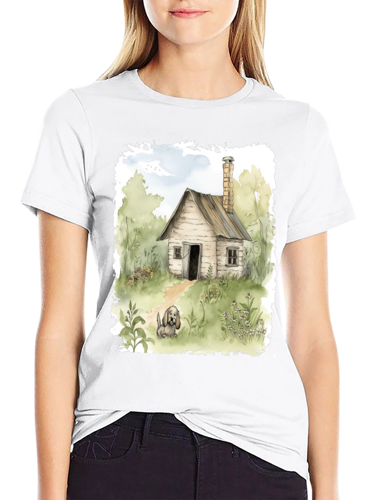 This stylish black tee features a charming watercolor-style graphic. The image depicts a cozy cabin nestled in a lush, green landscape, complete with a cute dog sitting nearby. Made from a comfortable, breathable fabric, this shirt is perfect for everyday wear. The print has a unique, artistic feel, making it a standout piece in any wardrobe. Ideal for casual outings, relaxed weekends, or as a thoughtful gift for nature and animal lovers. Enjoy the blend of comfort and style with this one-of-a-kind t-shirt.