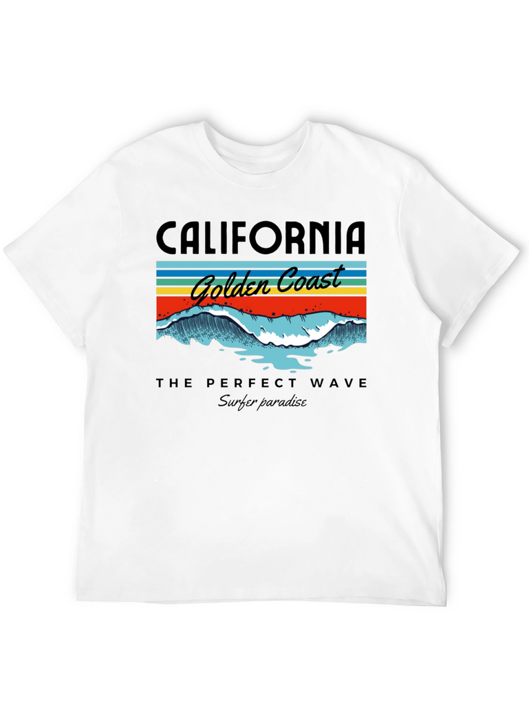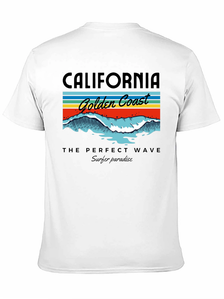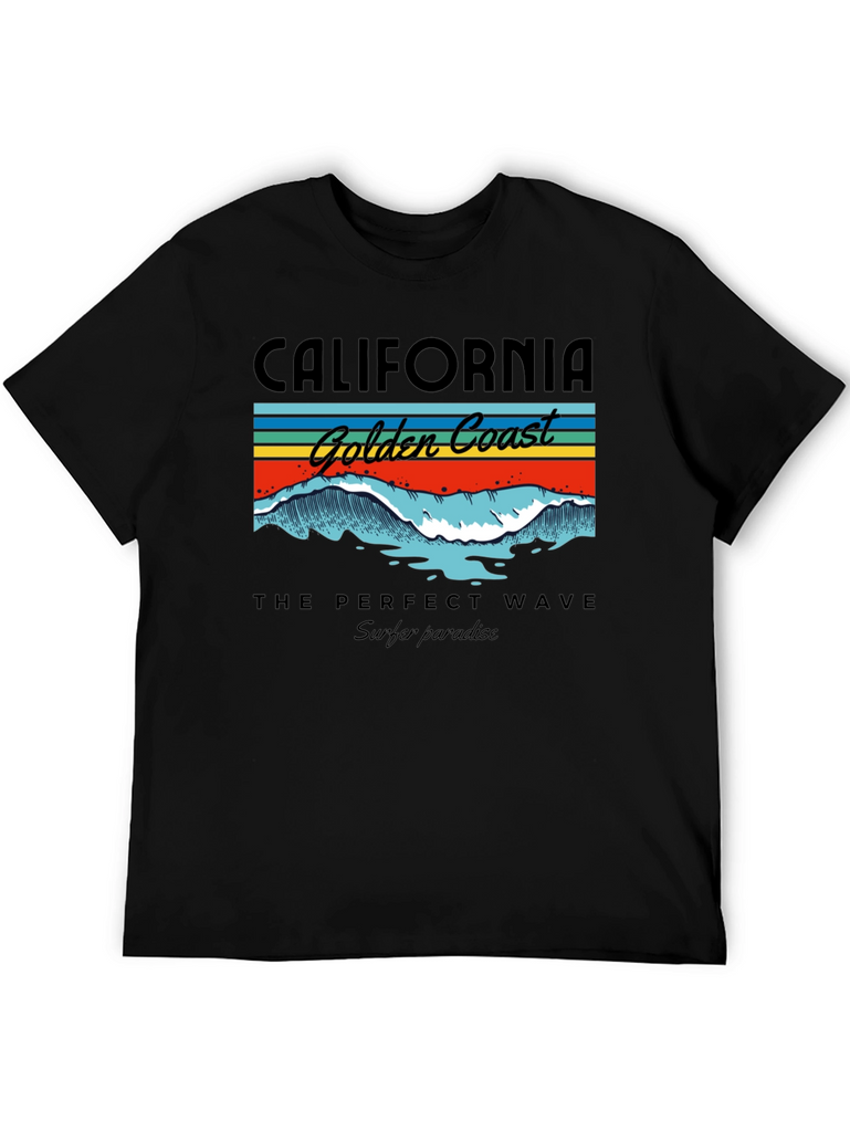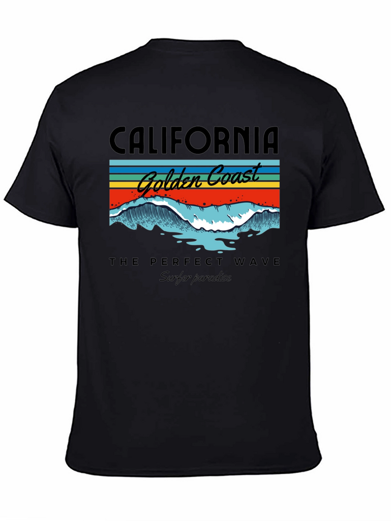 Embrace the laid-back California lifestyle with this stylish black tee. The shirt features a vibrant graphic showcasing the "Golden Coast" slogan above a retro-inspired wave design. Below, the words "The Perfect Wave - Surfer paradise" gives a nod to the surf culture. The eye-catching design is printed on a comfortable black fabric, perfect for everyday wear. Whether you're hitting the beach or hanging out with friends, this shirt is sure to turn heads and evoke the spirit of the California coast.