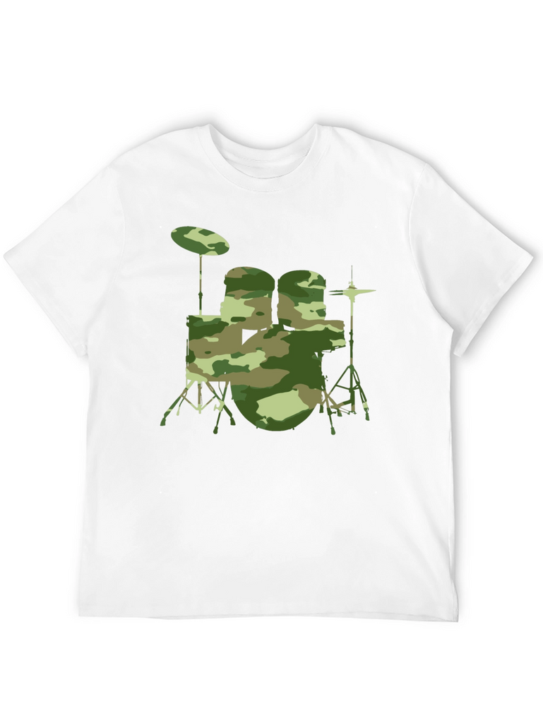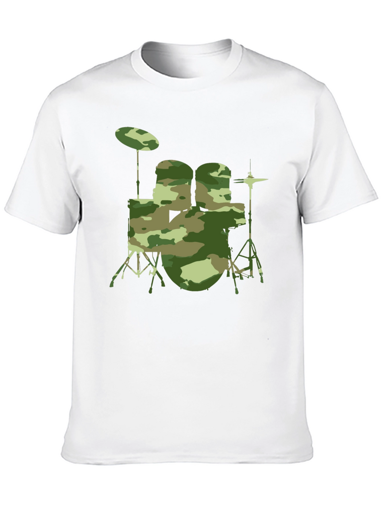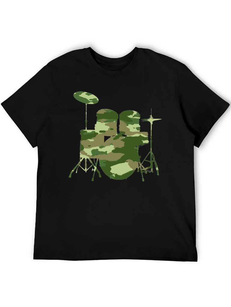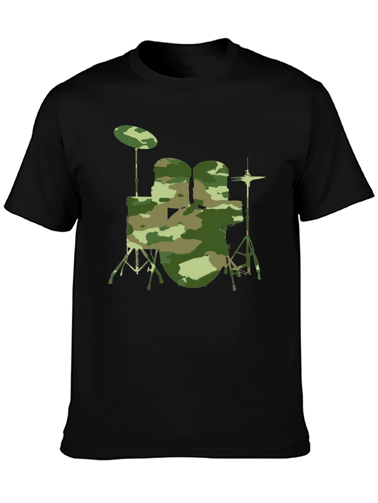 Showcase your love for music with this unique black t-shirt featuring a camouflage-patterned drum set graphic. The design gives a cool, edgy vibe, blending musical passion with military-inspired style. Made from comfortable, breathable fabric, this tee is perfect for everyday wear, concerts, band practice, or casual outings. The classic fit ensures a relaxed feel, making it an ideal choice for musicians and music enthusiasts alike. Stand out from the crowd and make a statement with this eye-catching camouflage drum set tee!
