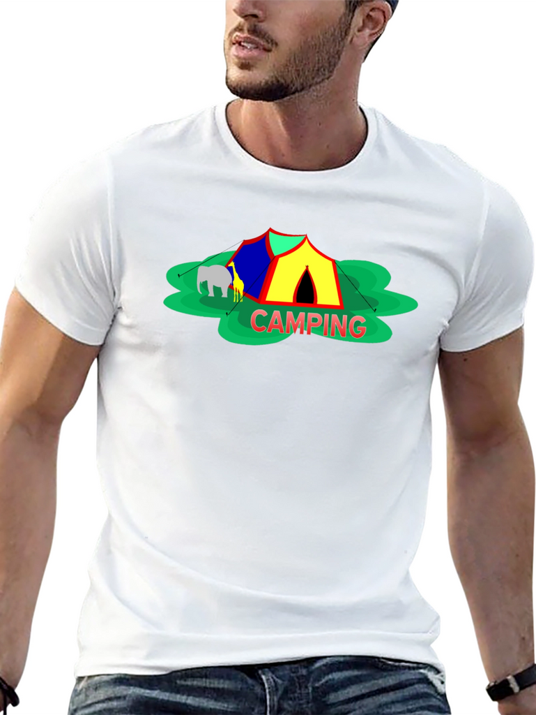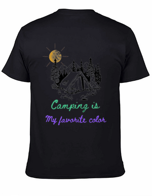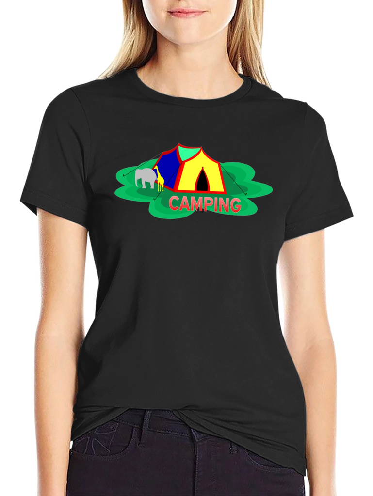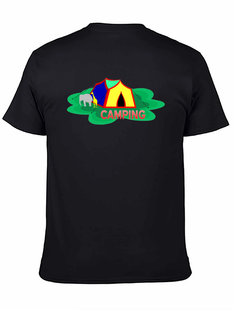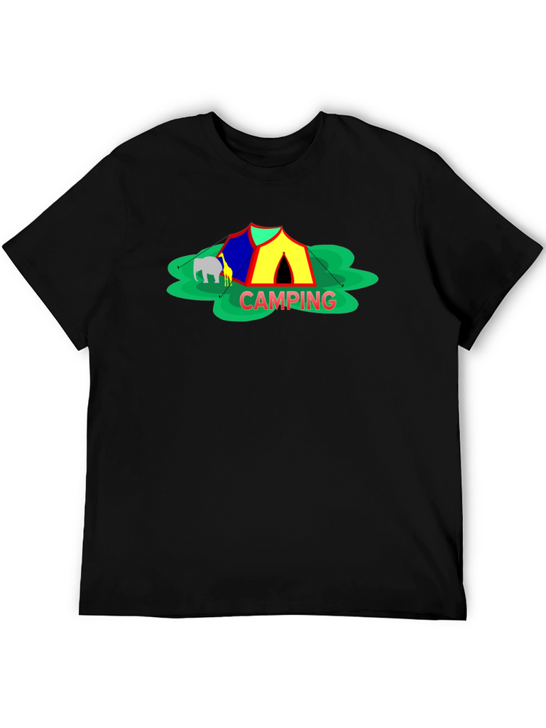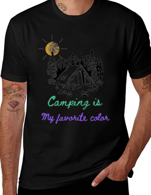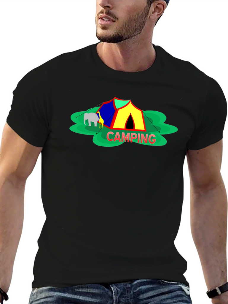 Embrace the spirit of outdoor adventure with this stylish black t-shirt featuring a vibrant 'Camping' themed graphic. The design showcases a colorful tent, cheerful green foliage, and animal silhouettes for a playful touch. Crafted from a comfortable-looking fabric, this tee is perfect for casual wear, camping trips, or as a unique gift for nature enthusiasts. The classic crew neck and relaxed fit make it a versatile addition to any wardrobe. Show off your love for the great outdoors in style!