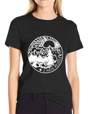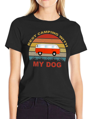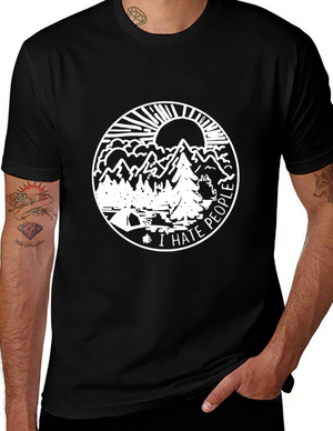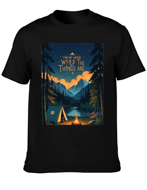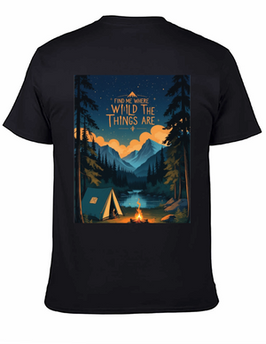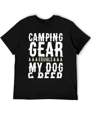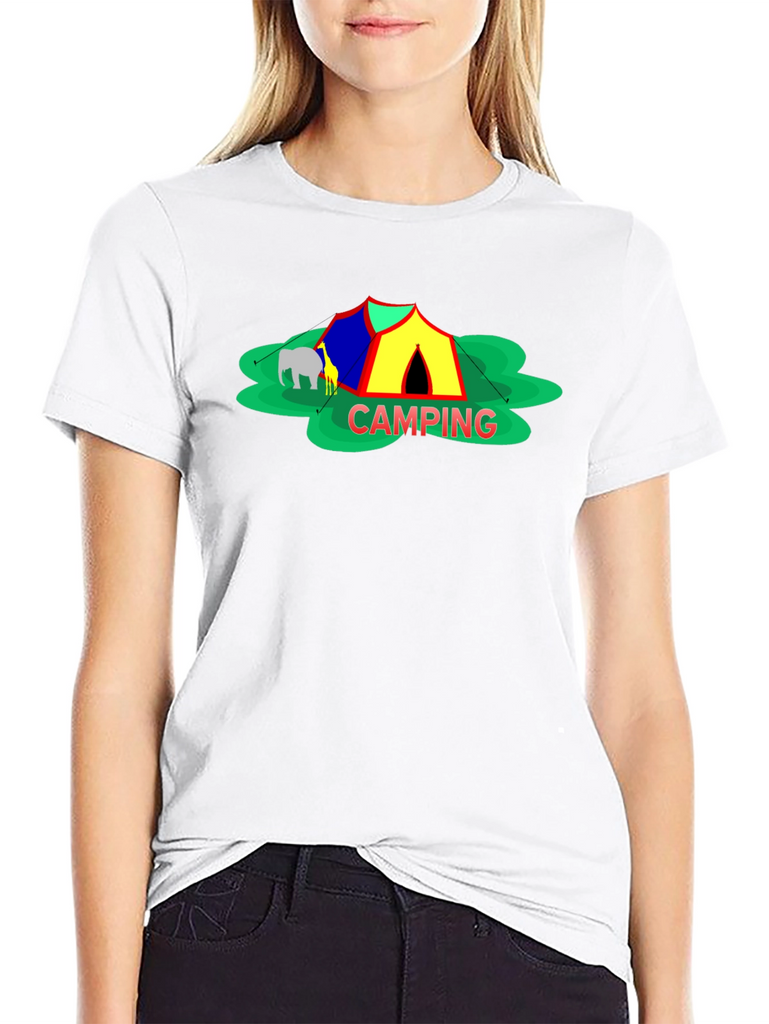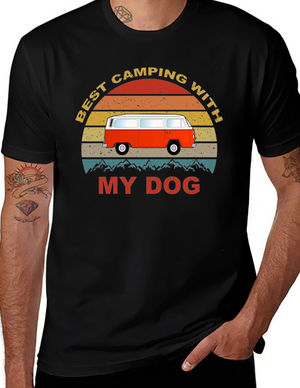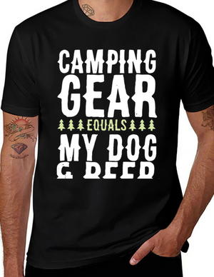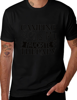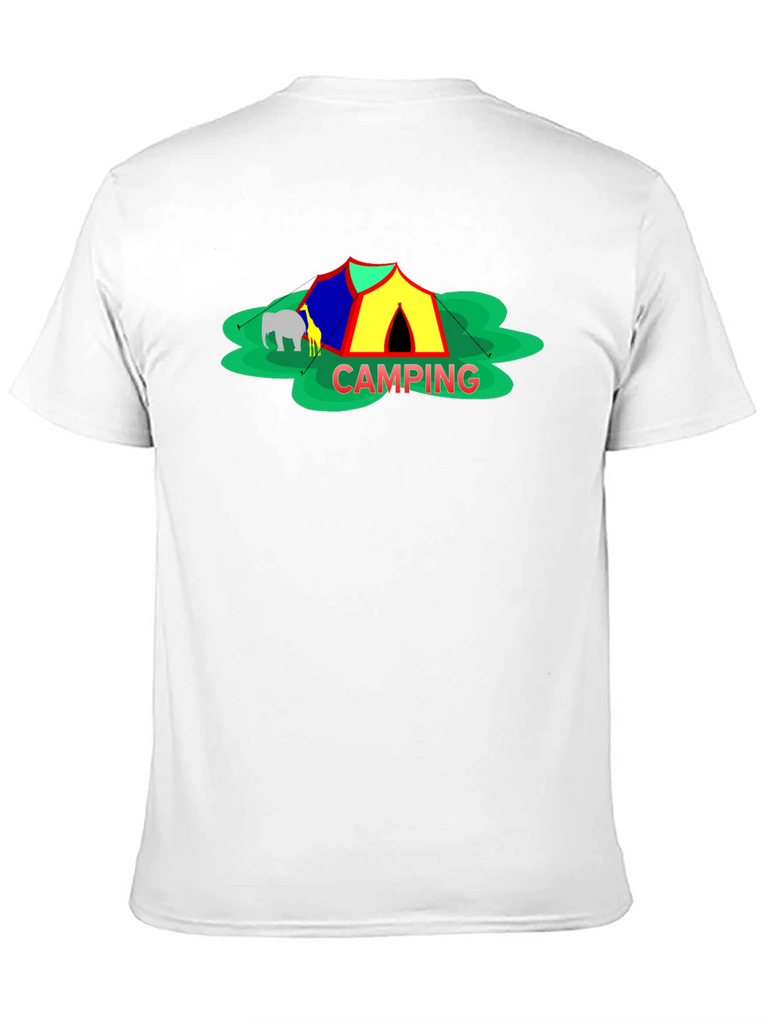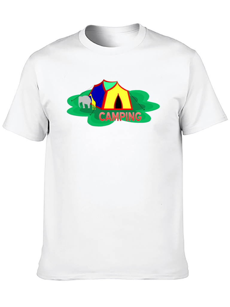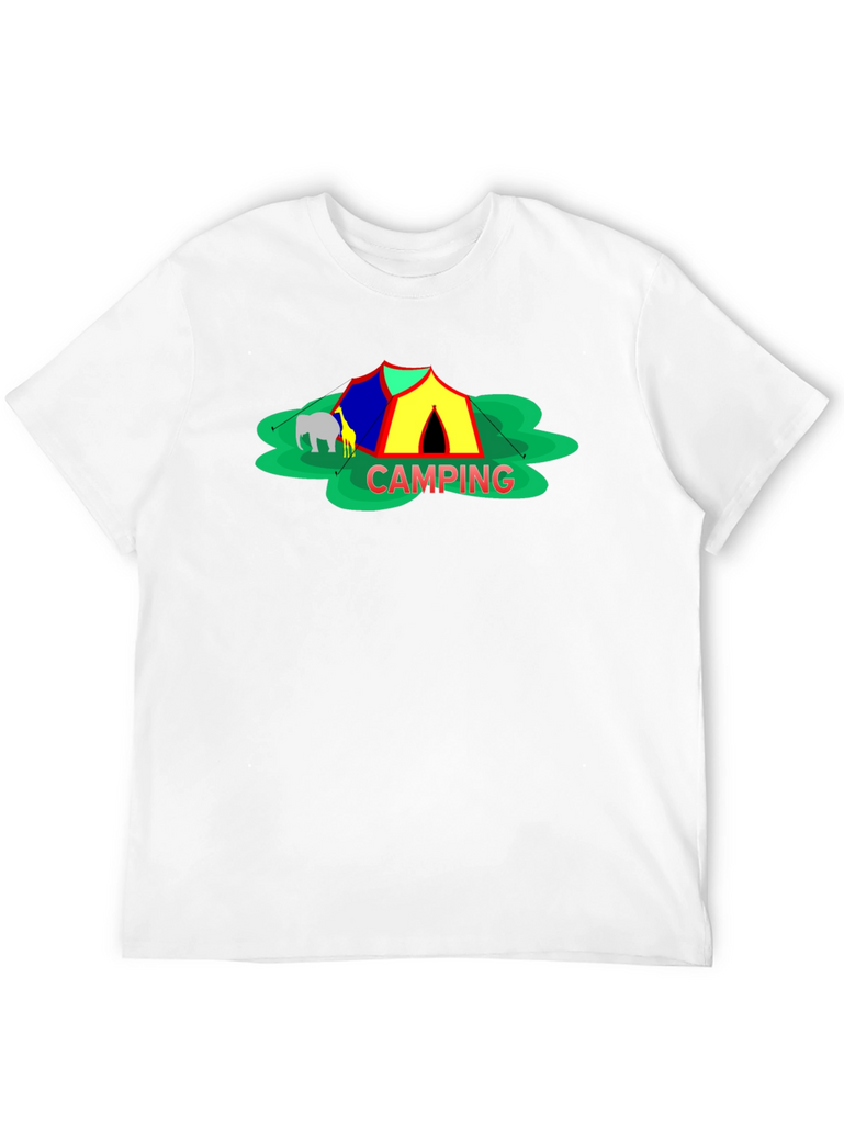 Embrace the spirit of outdoor adventure with this stylish black t-shirt featuring a vibrant 'Camping' themed graphic. The design showcases a colorful tent, cheerful green foliage, and animal silhouettes for a playful touch. Crafted from a comfortable-looking fabric, this tee is perfect for casual wear, camping trips, or as a unique gift for nature enthusiasts. The classic crew neck and relaxed fit make it a versatile addition to any wardrobe. Show off your love for the great outdoors in style!