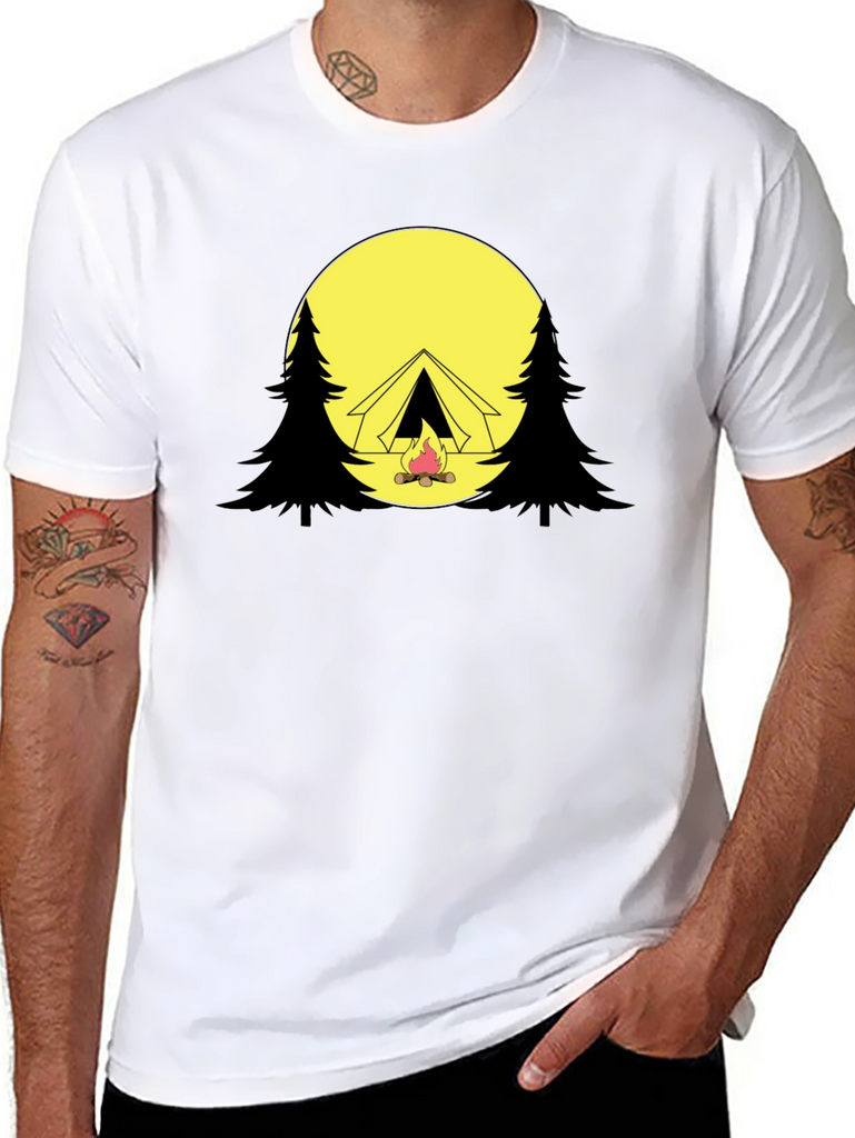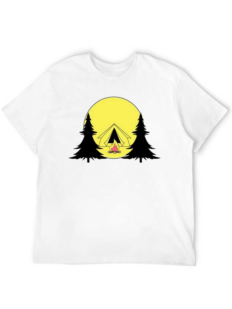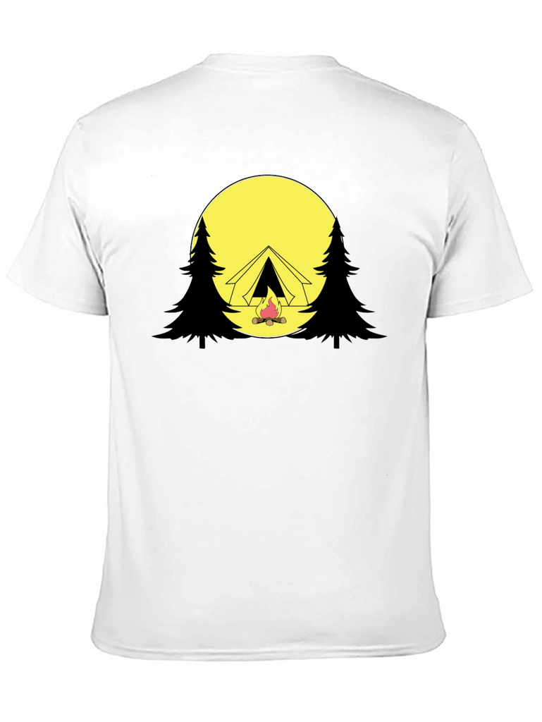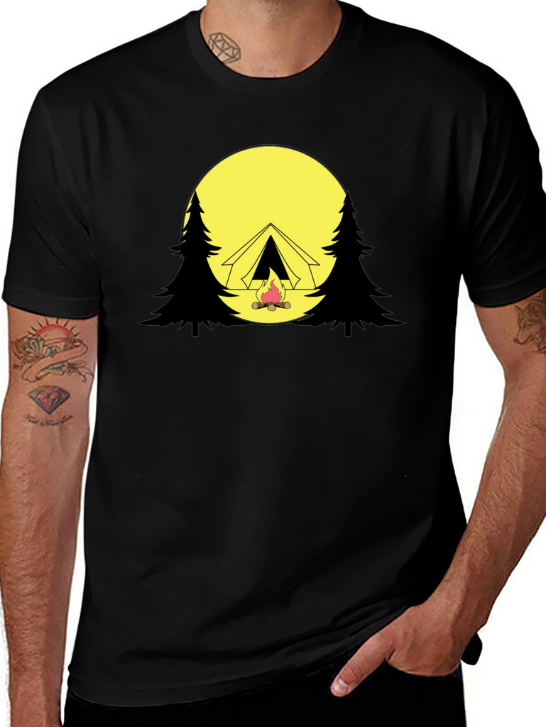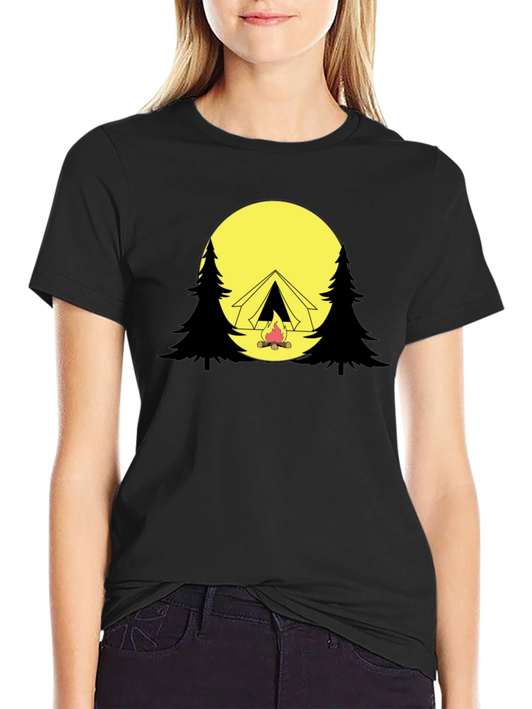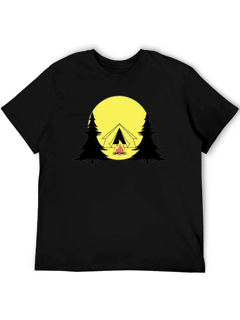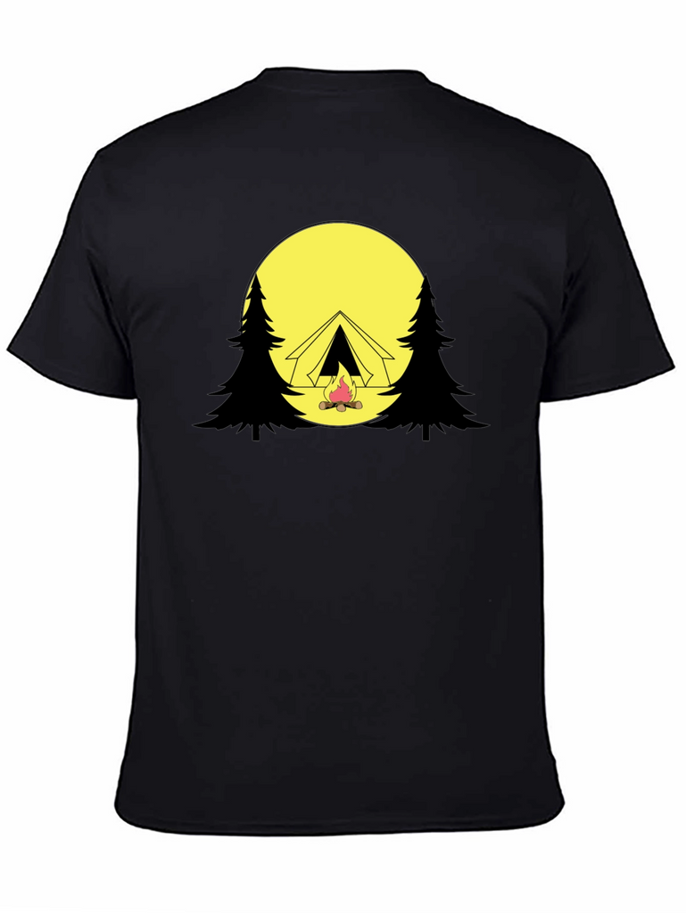 Embrace the spirit of the outdoors with this stylish black T-shirt. The shirt features a captivating graphic design showcasing a camping scene. A tent nestled between two tall pine trees, bathed in the soft glow of a full moon. In front of the tent is a cozy campfire adding to the ambiance of a night under the stars. This tee is made from a soft and breathable fabric ensuring comfort all day. Perfect for casual wear, outdoor adventures, or as a gift for camping enthusiasts. This unique shirt is sure to become a wardrobe favorite.