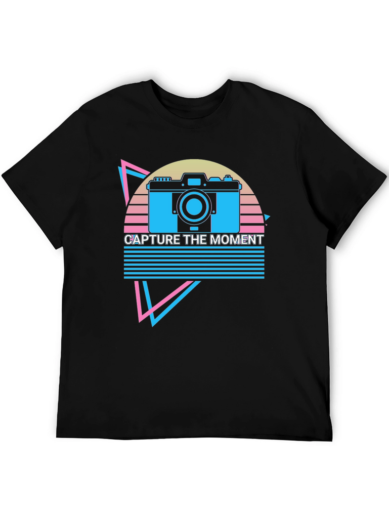Show off your love for photography with this eye-catching t-shirt. This black tee features a retro-inspired graphic design with a vintage-style camera, sun graphic, and geometric accents in vibrant hues of blue, pink, and yellow. The text "Capture the Moment" adds a motivational touch. Made from a comfortable, breathable fabric, this shirt is perfect for casual wear, photography enthusiasts, or anyone looking to add a unique piece to their wardrobe. Pair it with jeans or shorts for a relaxed and stylish look.