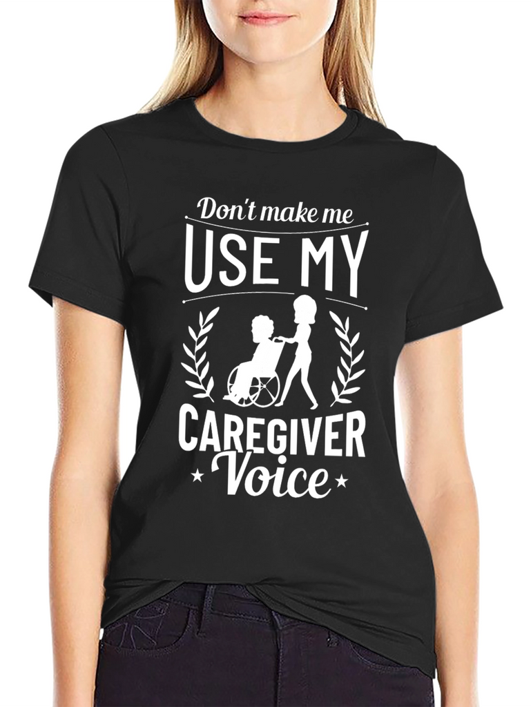 Show off your caregiver pride with this bold black T-shirt! The design features a humorous statement: "Don't make me USE MY CAREGIVER Voice." The design includes a silhouette of a caregiver assisting someone in a wheelchair, framed by laurel leaves and accented with stars. This tee is made from a comfortable fabric, perfect for everyday wear while you provide care. It's an ideal gift for dedicated caregivers who want to add some humor to their wardrobe. Get yours today!