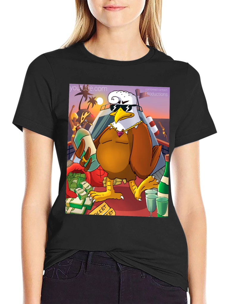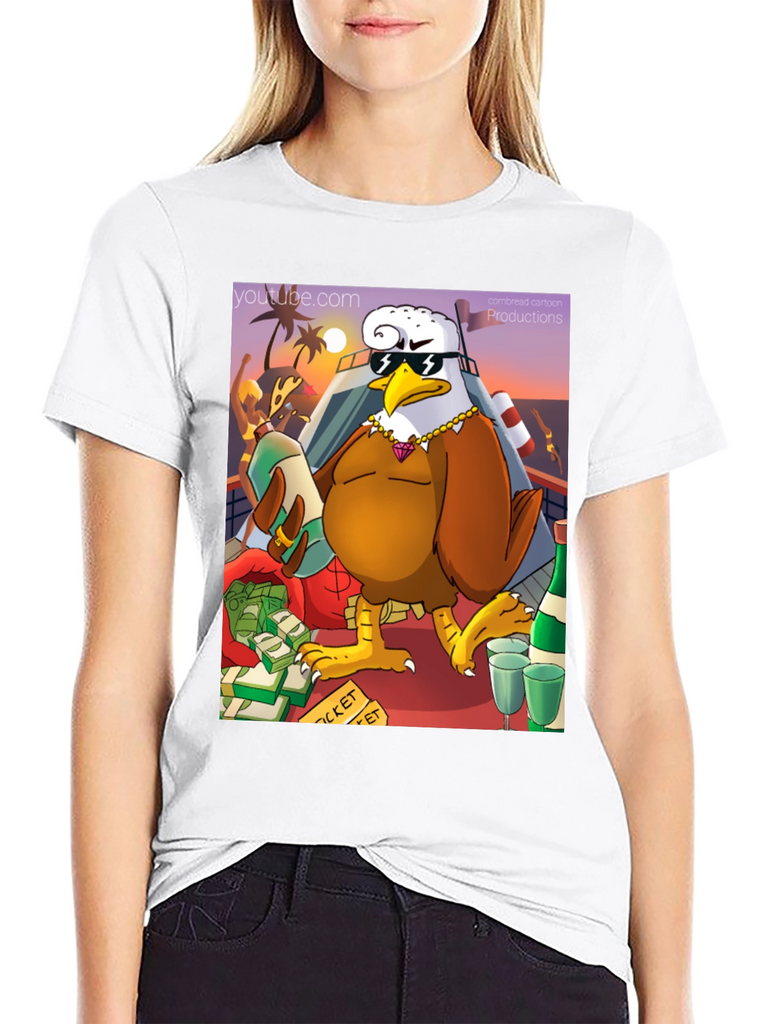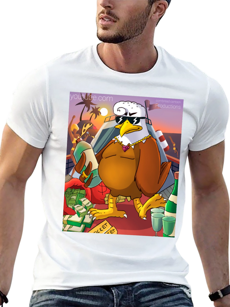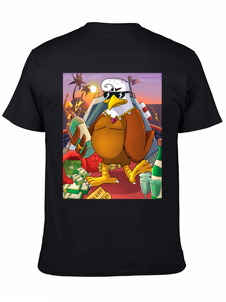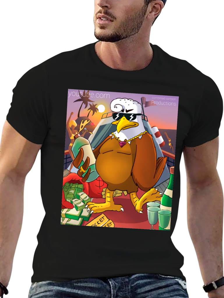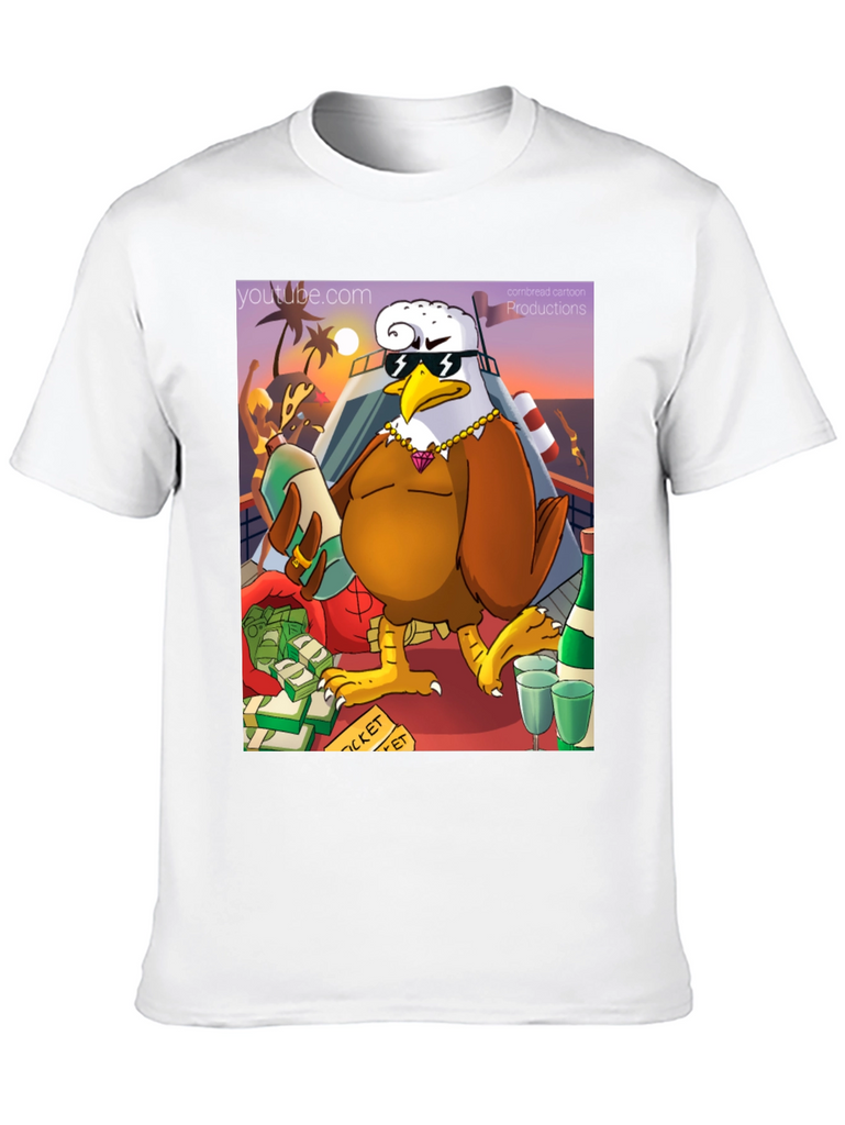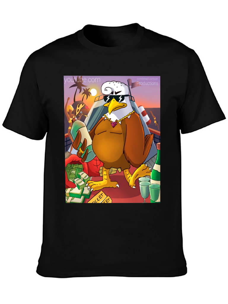 Show off your unique style with this eye-catching t-shirt. The shirt features a cartoon graphic of an eagle in sunglasses, wearing jewelry, surrounded by money and tickets. The design is brightly colored and detailed, making it a fun statement piece. Perfect for casual outings or lounging at home. The comfortable fit and soft fabric make this t-shirt a must-have addition to your wardrobe. Get yours today and show off your love for cartoons and fun!