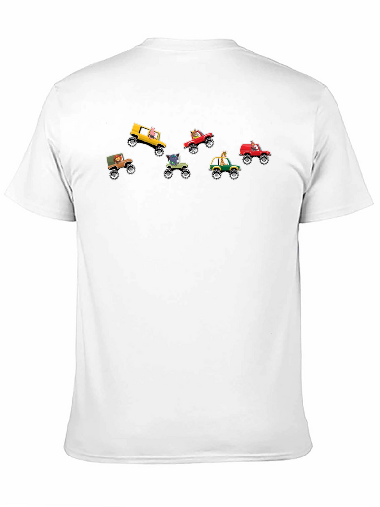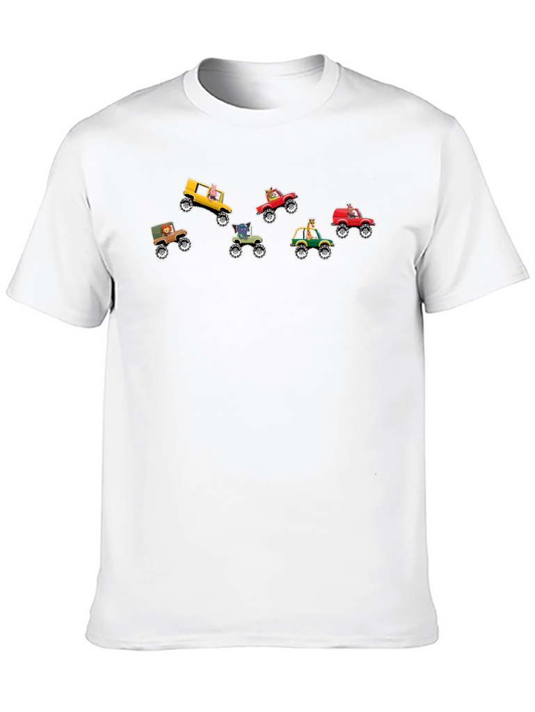 This eye-catching black t-shirt features a playful design of colorful cartoon monster trucks. Each truck showcases a different animal driver, adding a whimsical and fun touch. The shirt appears to be made of a comfortable, breathable material, perfect for casual wear. The print is vibrant and detailed, making it a standout piece in any wardrobe. Ideal for those who love unique, quirky apparel or anyone who wants to add a bit of fun to their everyday style. Wear it to casual outings, theme parties, or simply as a comfortable and stylish everyday tee.