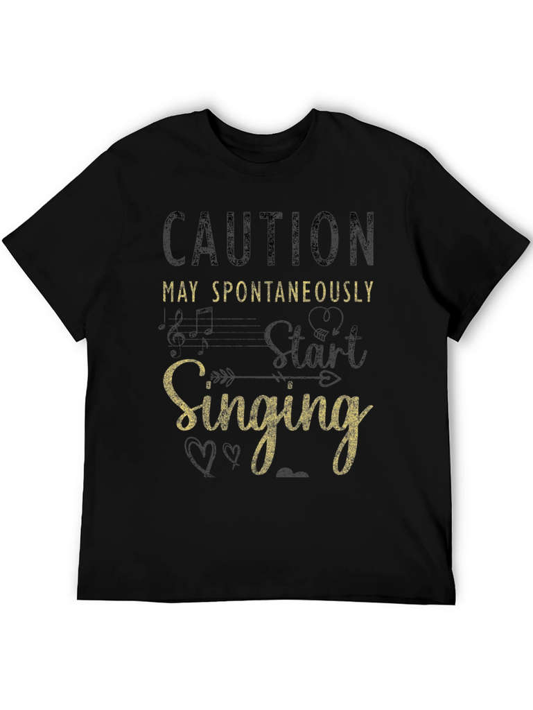 Show off your love for singing with this fun t-shirt! Featuring the phrase "Caution May Spontaneously Start Singing" in a stylish gold and black font. This tee is perfect for singers, music lovers, and anyone with a playful sense of humor. Made from a comfortable material, it's ideal for everyday wear, rehearsals, or casual outings. Let everyone know about your musical talent and be prepared for spontaneous performances wherever you go! A great conversation starter and a must-have addition to any singer's wardrobe. Get yours today and spread the joy of music!