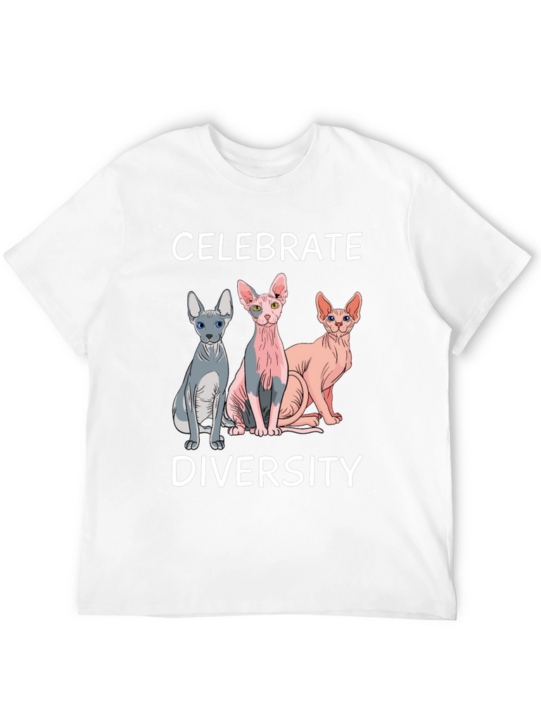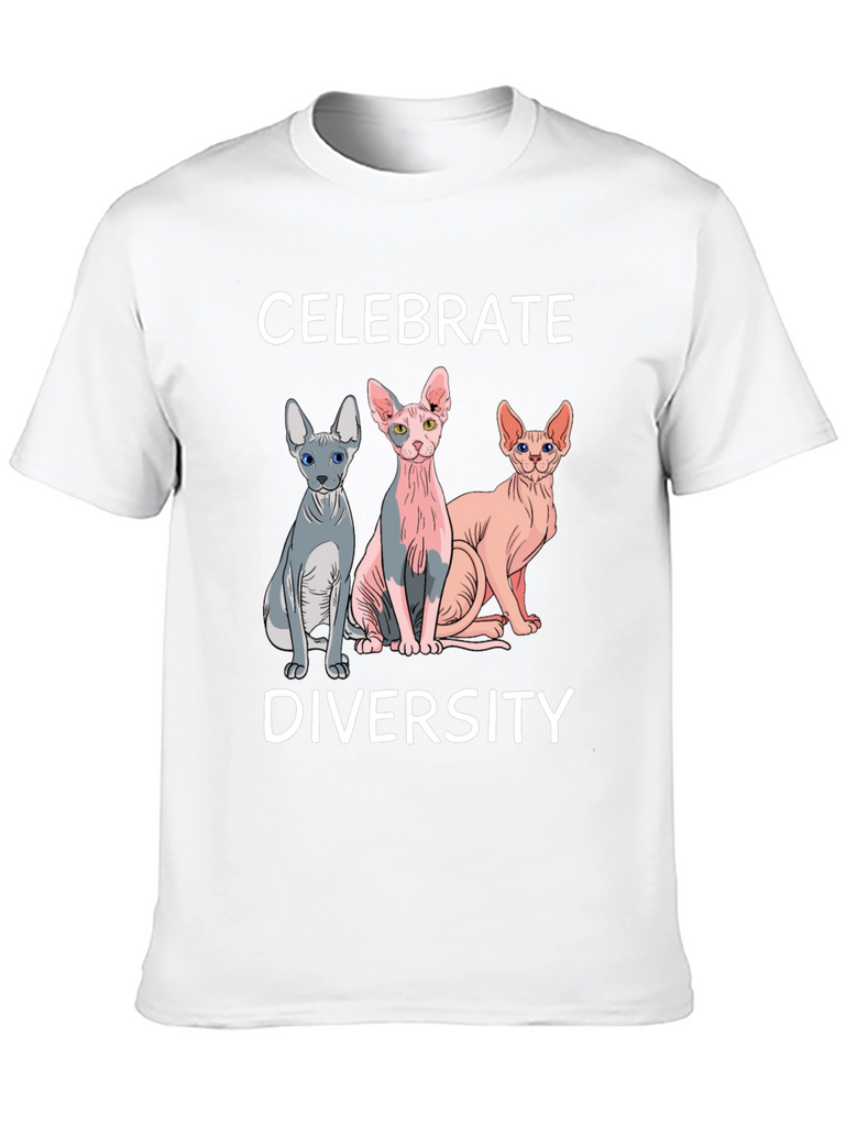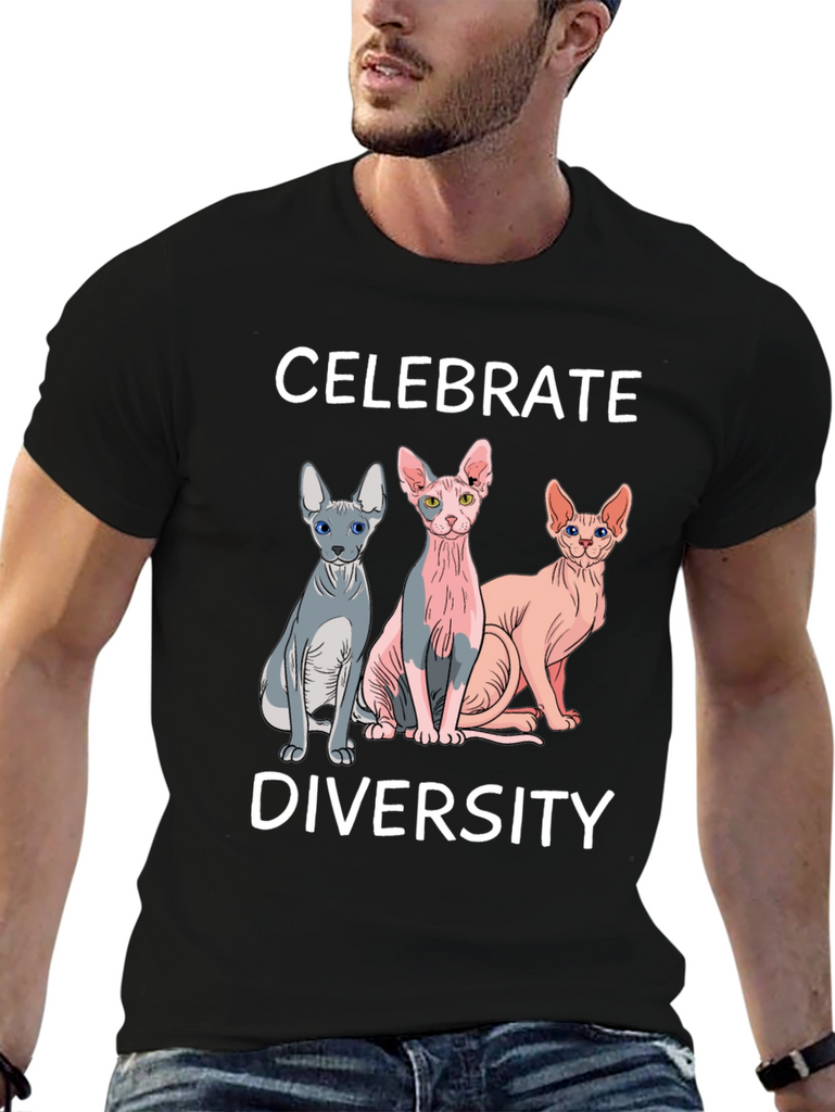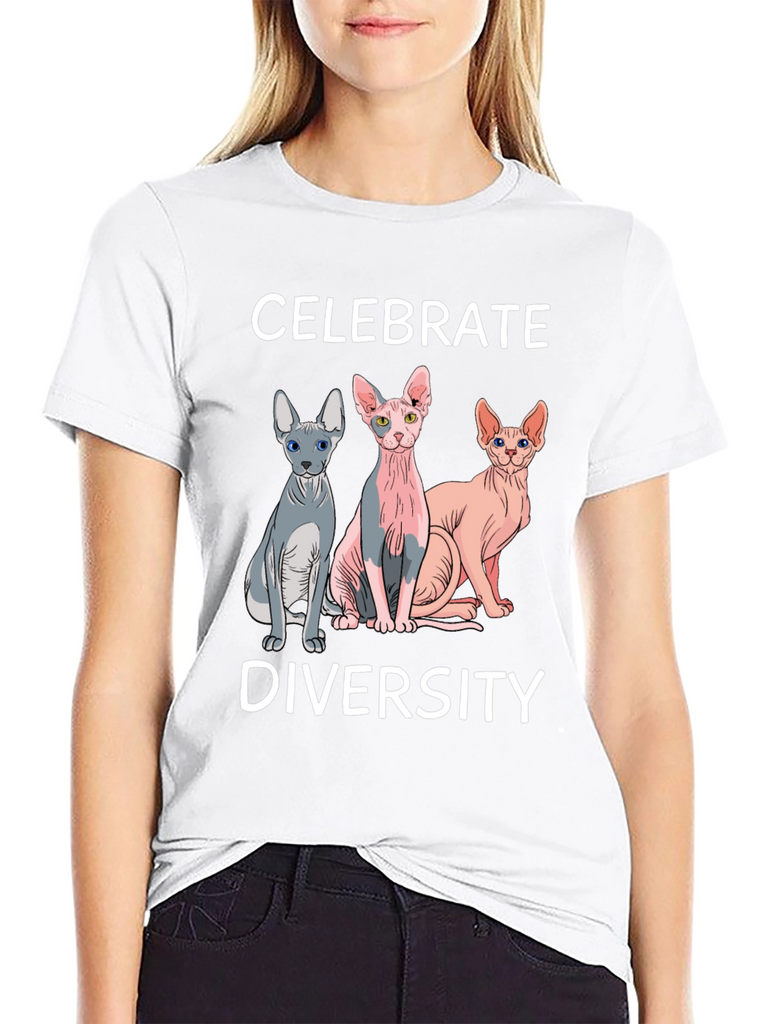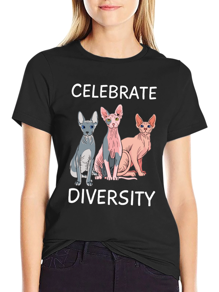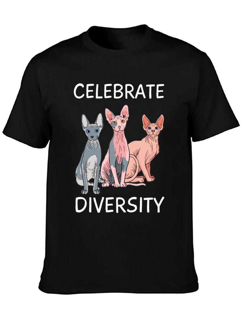 Showcase your love for unique feline friends with this Celebrate Diversity T-shirt. Featuring a vibrant illustration of three different Sphynx cats. The design is printed on a soft, comfortable black material. This tee is perfect for cat lovers, animal advocates, or anyone who wants to celebrate what makes us different. Wear it to casual outings, cat shows, or as a statement piece to spark conversations. Let this tee be a reminder to embrace uniqueness and promote inclusivity wherever you go!