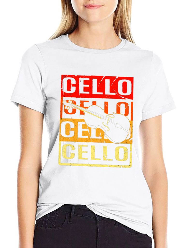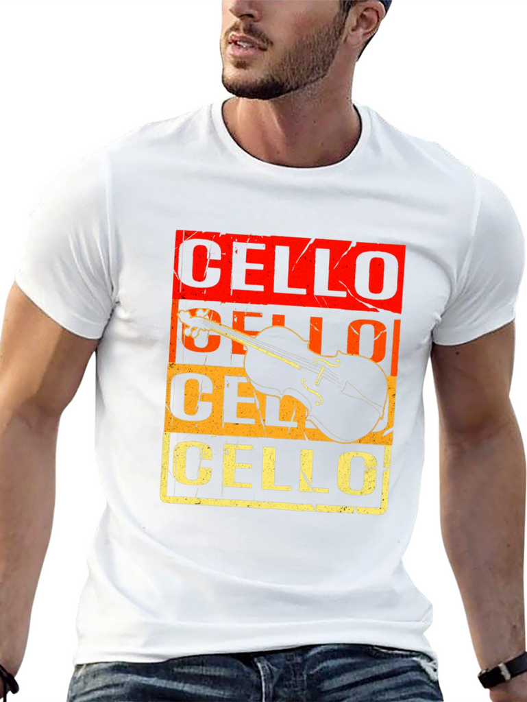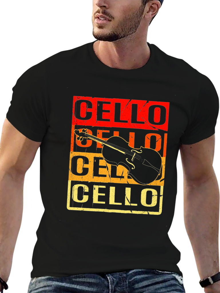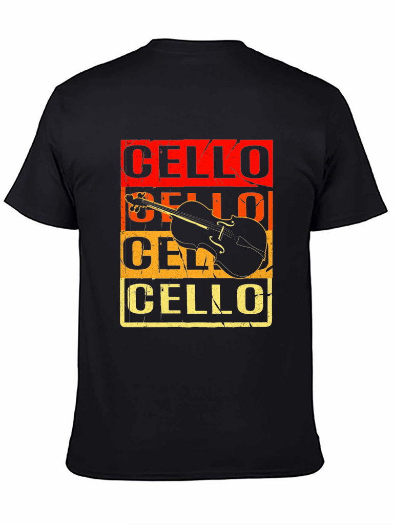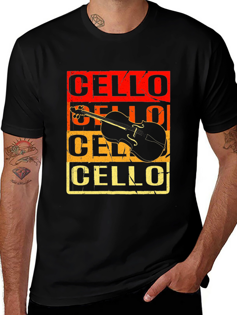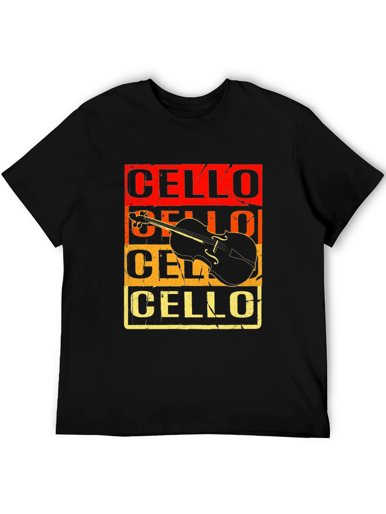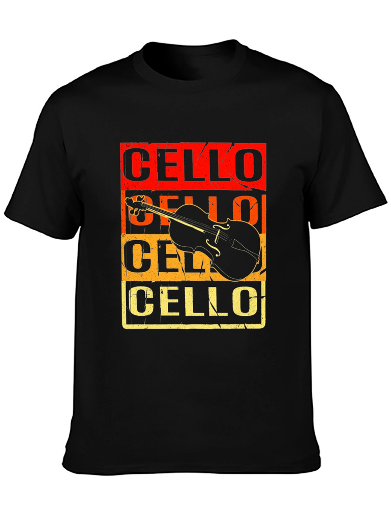 Show your love for classical music with this unique Cello Graphic T-Shirt. This stylish black tee features a vintage-inspired design with the word "CELLO" stacked in vibrant red, orange, and yellow blocks. A silhouette of a cello is prominently displayed over the word blocks. Made from a comfortable material, this t-shirt is perfect for musicians, music students, and anyone who appreciates the beautiful sound of the cello. Wear it to concerts, rehearsals, or as an everyday statement piece to showcase your passion for music. It's a great gift for cello players and music enthusiasts!