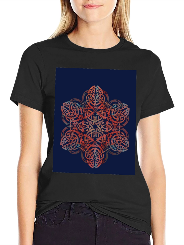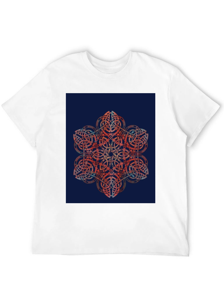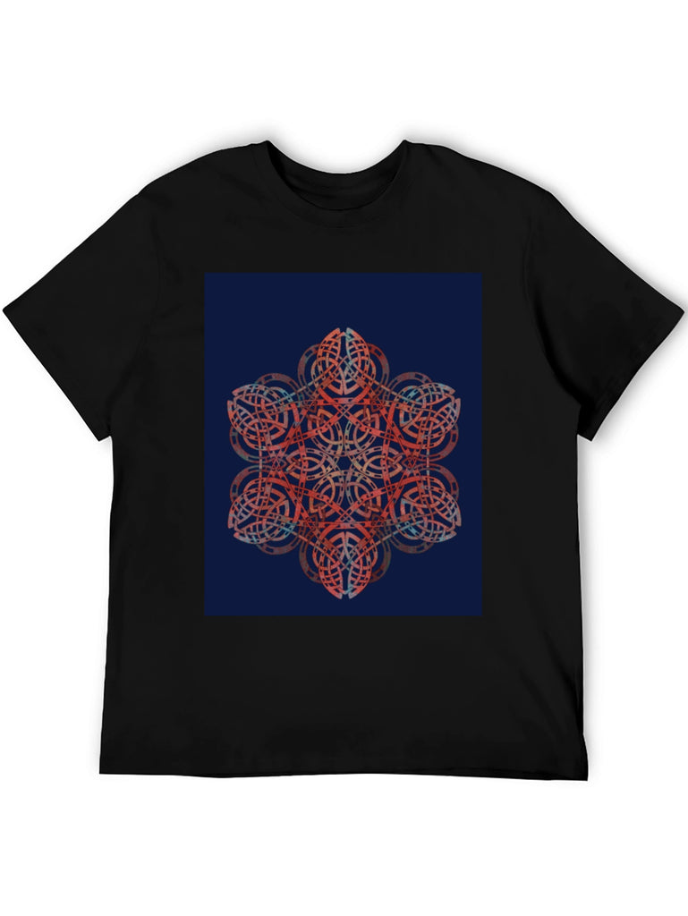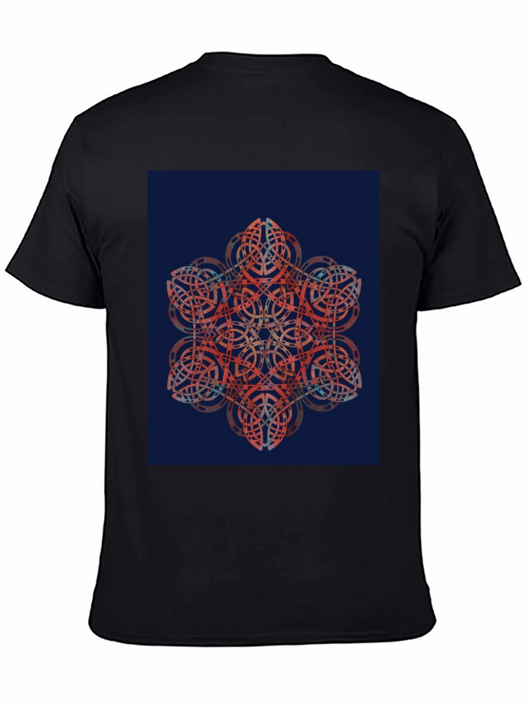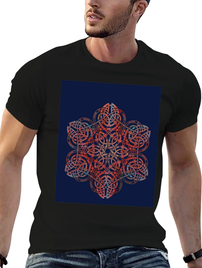 Showcase your unique style with this striking black t-shirt. The focal point is a detailed, colorful Celtic knot design, set against a navy backdrop. The intricate pattern features interwoven lines in shades of red, beige, and turquoise, creating a visually captivating effect. Crafted from what appears to be a soft, comfortable fabric, this tee is perfect for everyday wear. Its classic fit makes it versatile for various casual occasions. Wear it to express your individuality at social gatherings, or simply as a stylish statement piece. The design adds an element of mystique and artistry to your wardrobe.