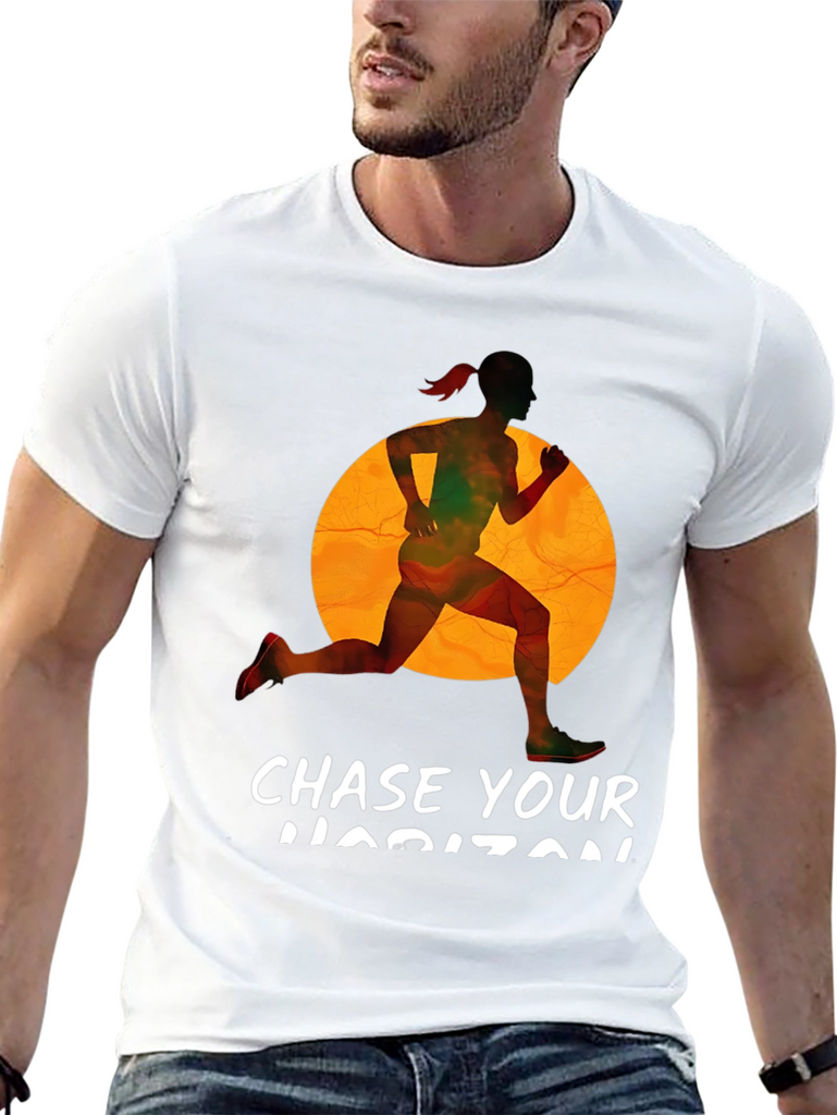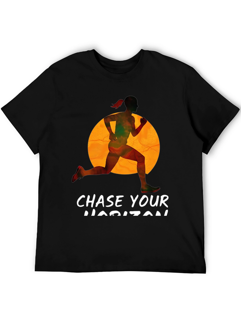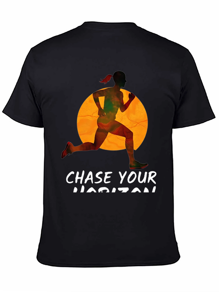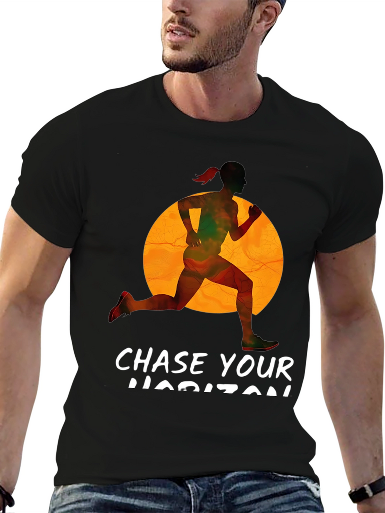 This black t-shirt features a striking graphic of a runner silhouetted against an orange sun-like background. The shirt promotes an active and aspirational lifestyle, with the motivational phrase "CHASE YOUR HORIZON" printed below the image. The garment appears to be made from a comfortable, breathable fabric, likely cotton or a cotton blend, making it suitable for everyday wear or light athletic activities. The design makes it a great conversation starter. Ideal for runners, fitness enthusiasts, or anyone who appreciates motivational apparel. It has a classic fit and short sleeves. A wardrobe staple for casual wear, workouts, or outdoor adventures.