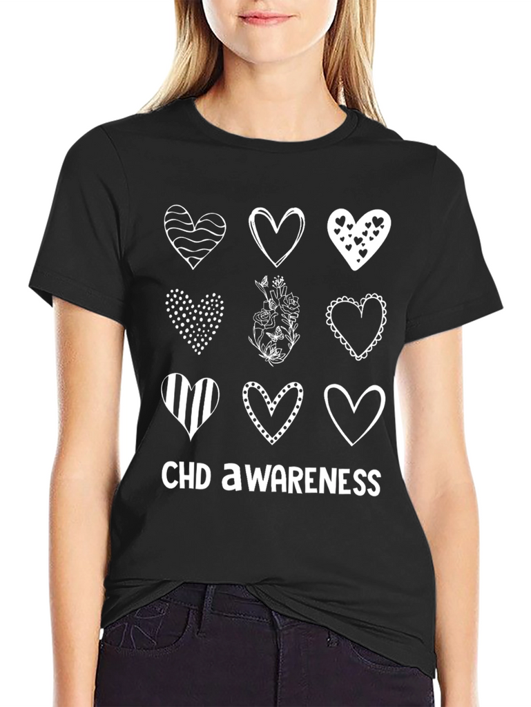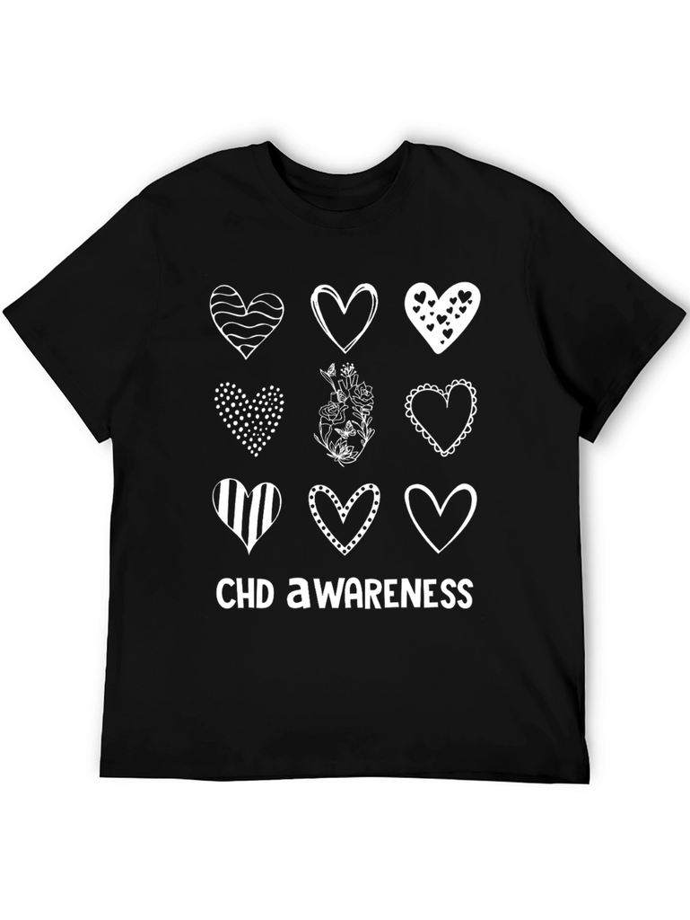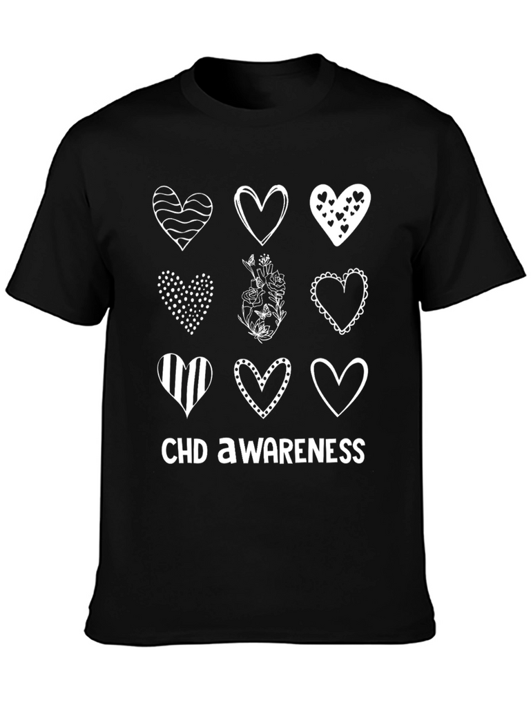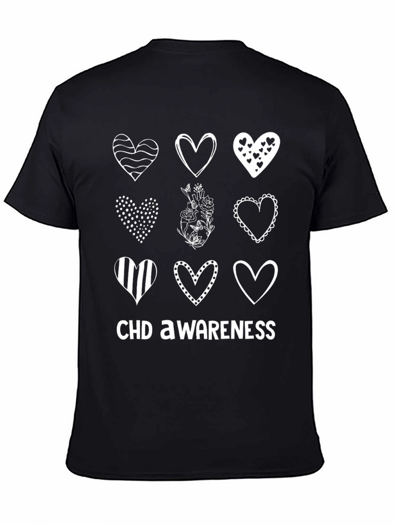 Show your support with this stylish CHD Awareness T-shirt. Featuring a unique design with nine different hearts, each with its own distinctive pattern, this tee is both meaningful and fashionable. The hearts are arranged in a grid pattern, with 'CHD AWARENESS' printed boldly below, making it a statement piece for any occasion. Made from a comfortable, breathable fabric, it’s perfect for everyday wear and spreading awareness. Wear it to support loved ones, raise awareness, or simply as a stylish addition to your wardrobe. Help make a difference, one heart at a time.