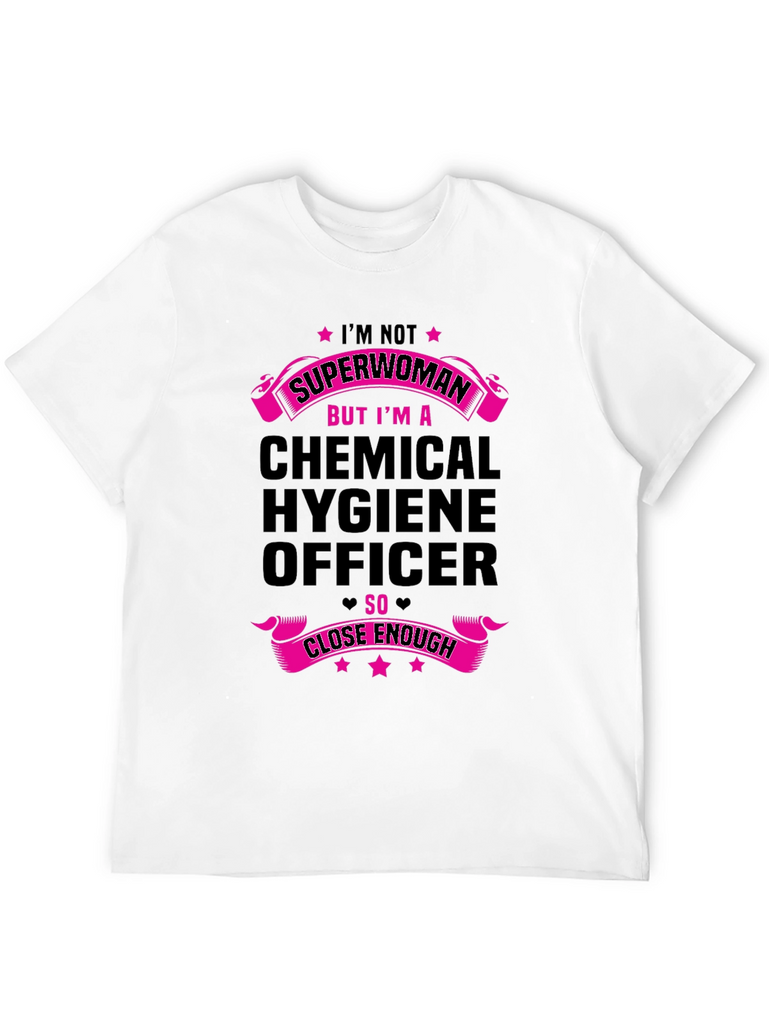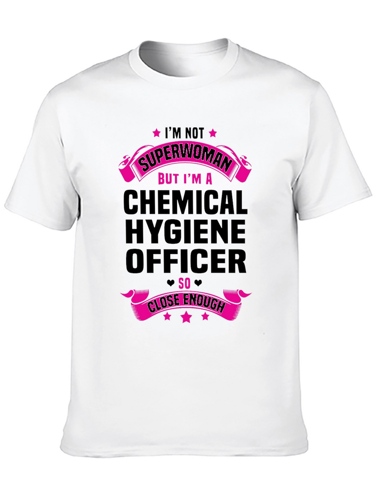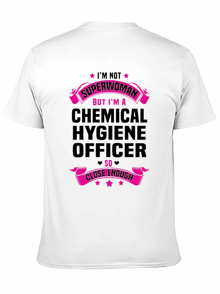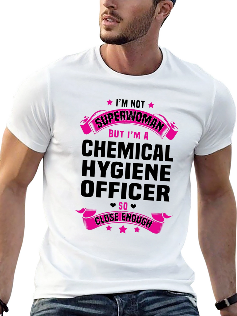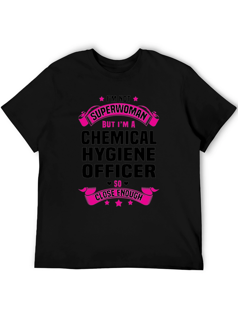 Show off your dedication to chemical safety with this stylish black t-shirt. The shirt features a bold graphic design in vibrant pink, declaring 'I'M NOT SUPERWOMAN BUT I'M A CHEMICAL HYGIENE OFFICER SO CLOSE ENOUGH.' Made from comfortable fabric, this tee is perfect for everyday wear at work or casual outings. A fun and unique way to express your profession and sense of humor. Get yours today and let everyone know you're practically a superwoman in the lab!