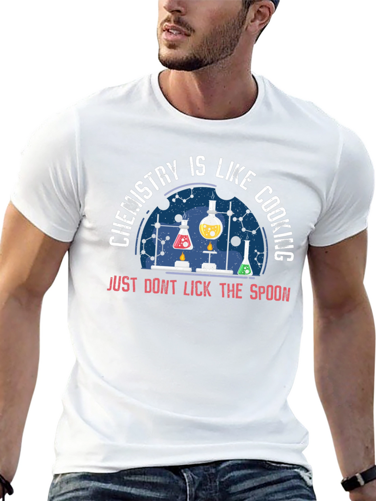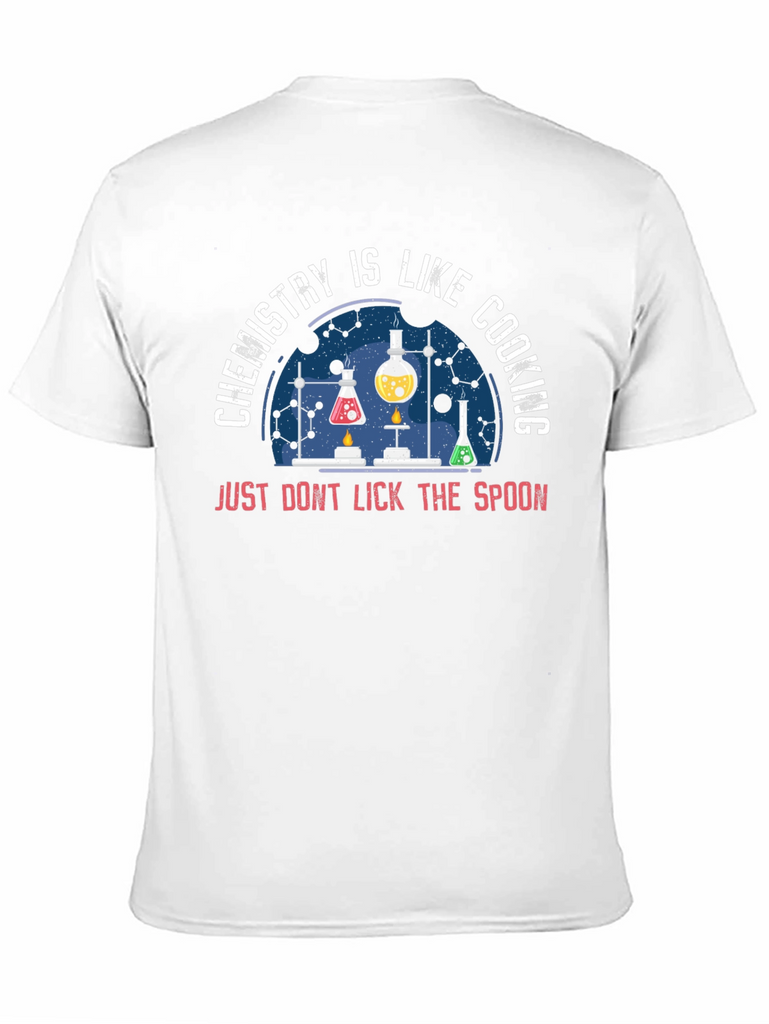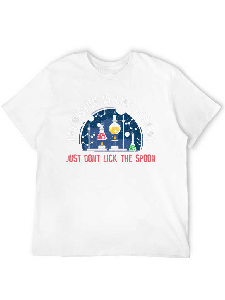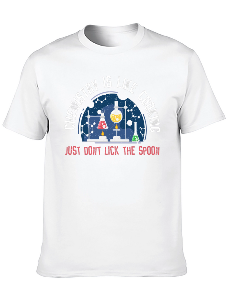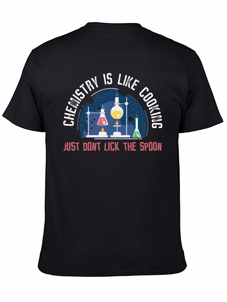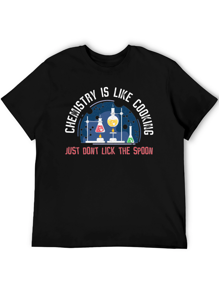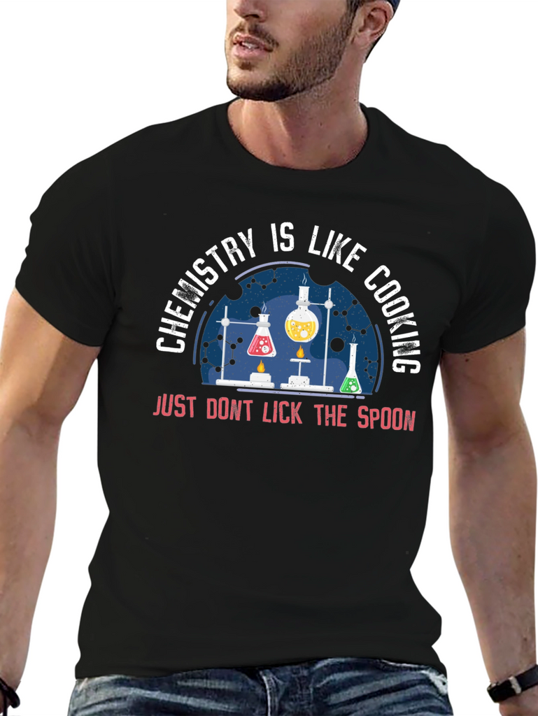 This black t-shirt features a witty design that cleverly combines the worlds of chemistry and cooking. The central graphic showcases chemistry glassware with the phrase 'CHEMISTRY IS LIKE COOKING' arched above it. Below this is the humorous caution: 'JUST DON'T LICK THE SPOON'. Made from a comfortable-looking fabric, this tee is perfect for science enthusiasts, cooks, or anyone with a good sense of humor. Wear it to school, the lab, casual outings, or even while cooking! It’s a great conversation starter and a fun way to show off your love for science and cooking.