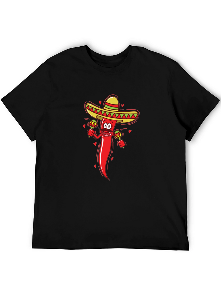 Spice up your wardrobe with this fun and unique graphic tee. This black t-shirt features a vibrant, eye-catching design of a cartoon red chili pepper wearing a sombrero and playing maracas. The playful design is sure to be a conversation starter and add a touch of humor to your everyday style. Perfect for casual wear, parties, or anyone who loves a little spice in their life. Made from a comfortable fabric, this tee is as enjoyable to wear as it is to look at. A great way to show off your fun and quirky personality!